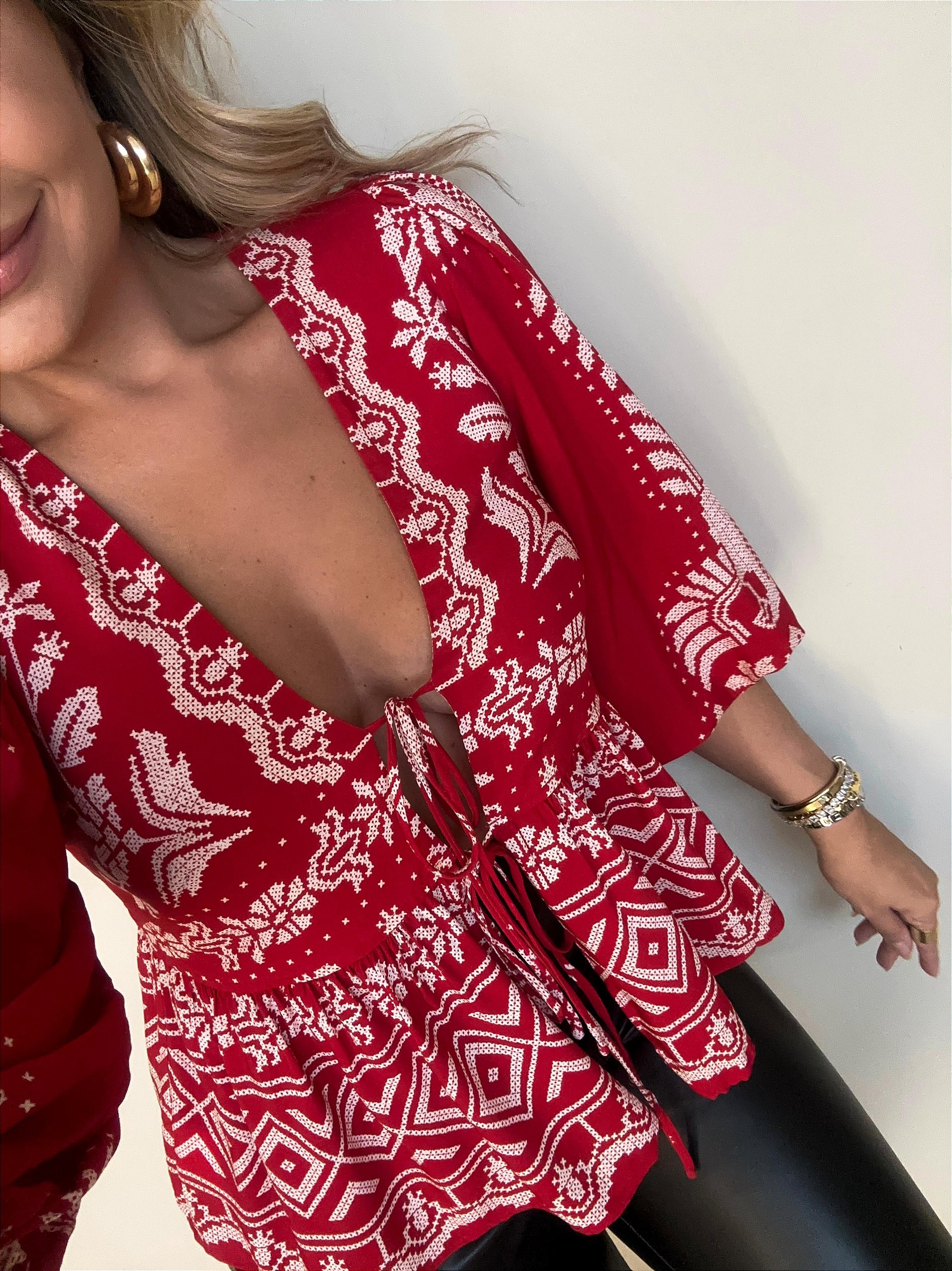 Bata amarração relicário tropical farm com decote profundo que se ajusta com laços delicados. Tem mangas bufantes com elástico nos punhos, tecido viscose.