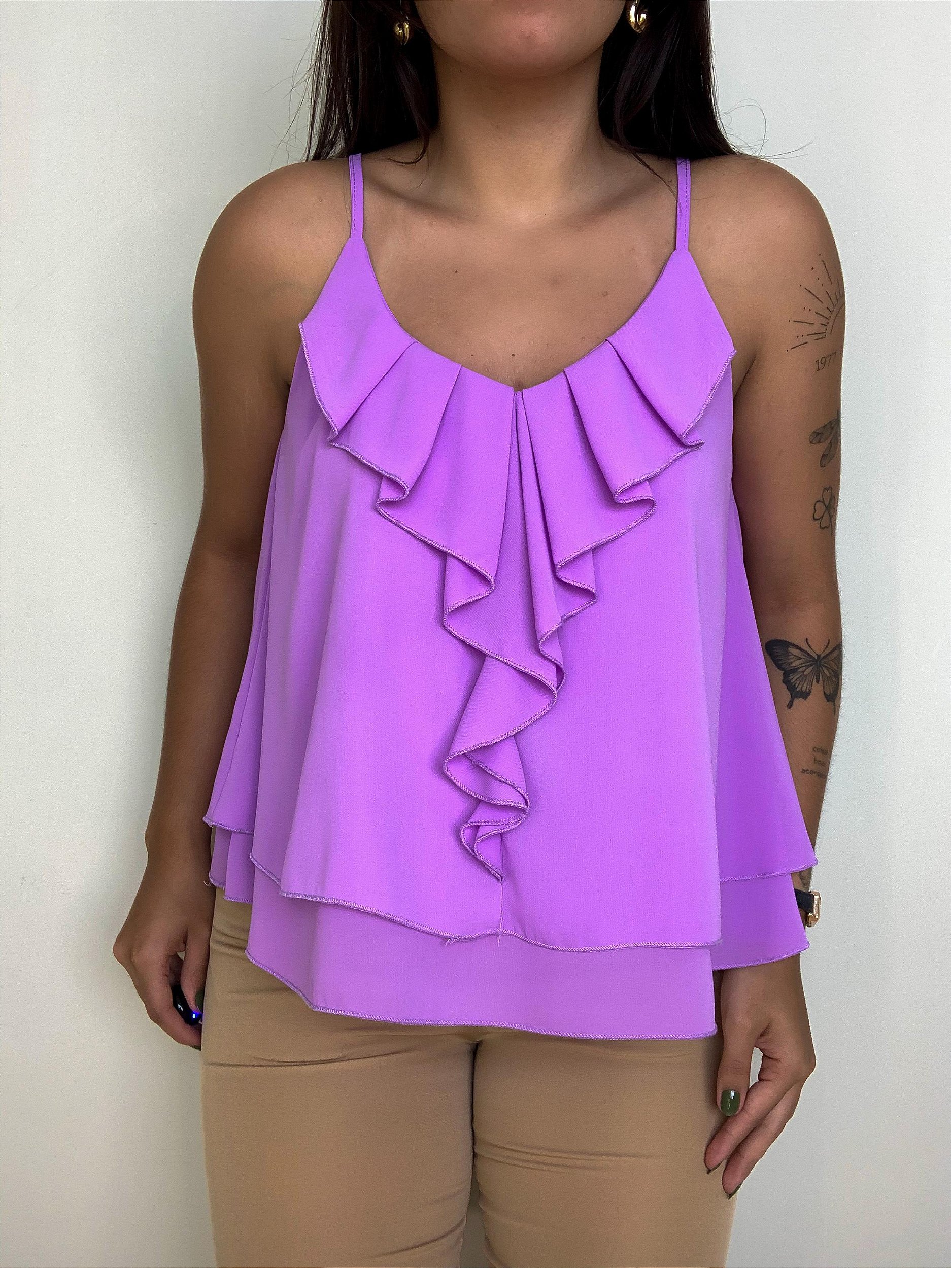 Bata boho lilás com decote em v e babados no busto, fluida e super charmosa. Tem alcinha fina ajustável. Tecido chiffon.