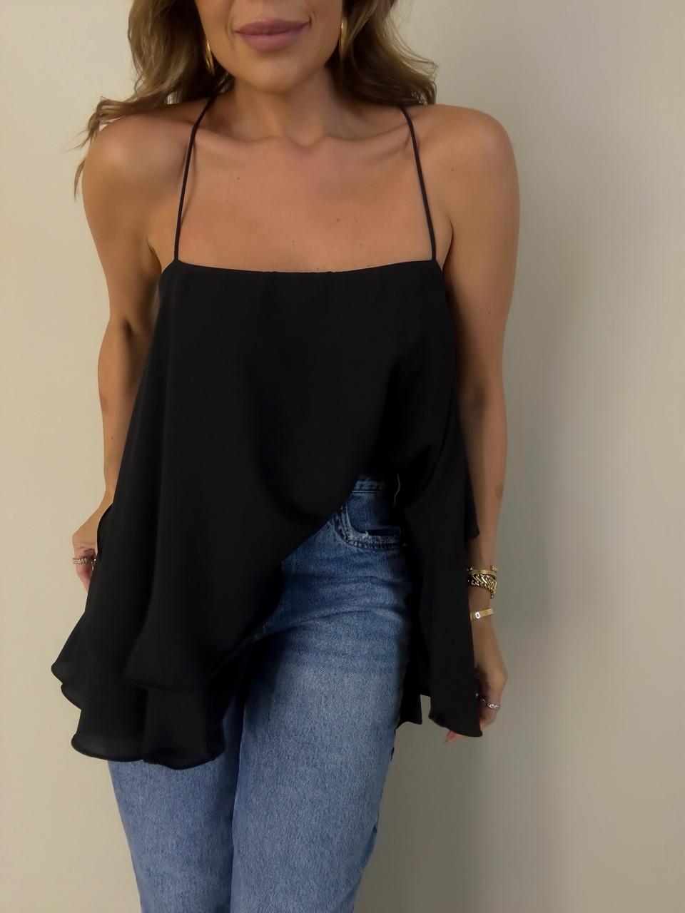 Blusa preta de alças finas com modelagem fluida e caimento leve, perfeita para um visual moderno e elegante. O modelo possui decote reto e design assimétrico na barra, que cria movimento e traz um toque sofisticado à peça. Nas costas, o destaque fica para a abertura com tiras delicadas com amarração ajustável. Pode ser usada de dois lados diferentes.
