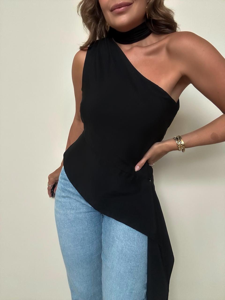 Blusa preta nula manga com design assimétrico e modelagem moderna, perfeita para produções elegantes e cheias de estilo. Possui zíper lateral e acompanha faixa para amarração. Ideal para composições noturnas, eventos especiais ou looks fashionistas do dia a dia. Tecido viscose.