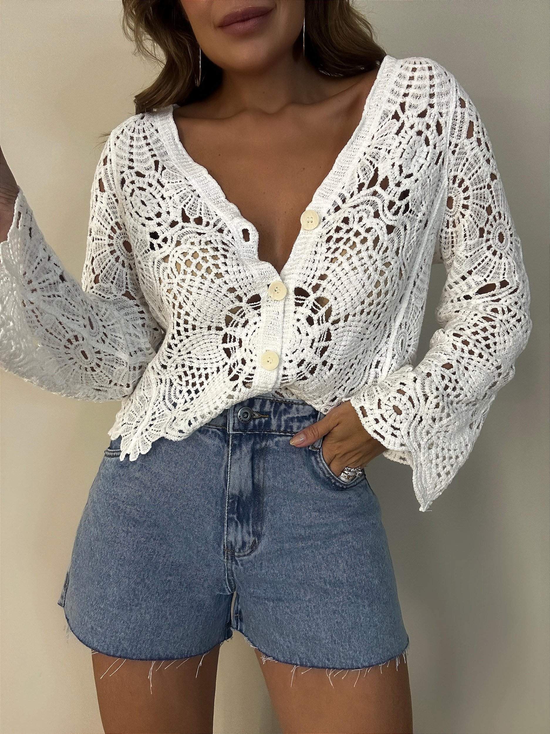 Blusa bata crochê branca com modelagem soltinha e caimento leve, fechamento por botões.