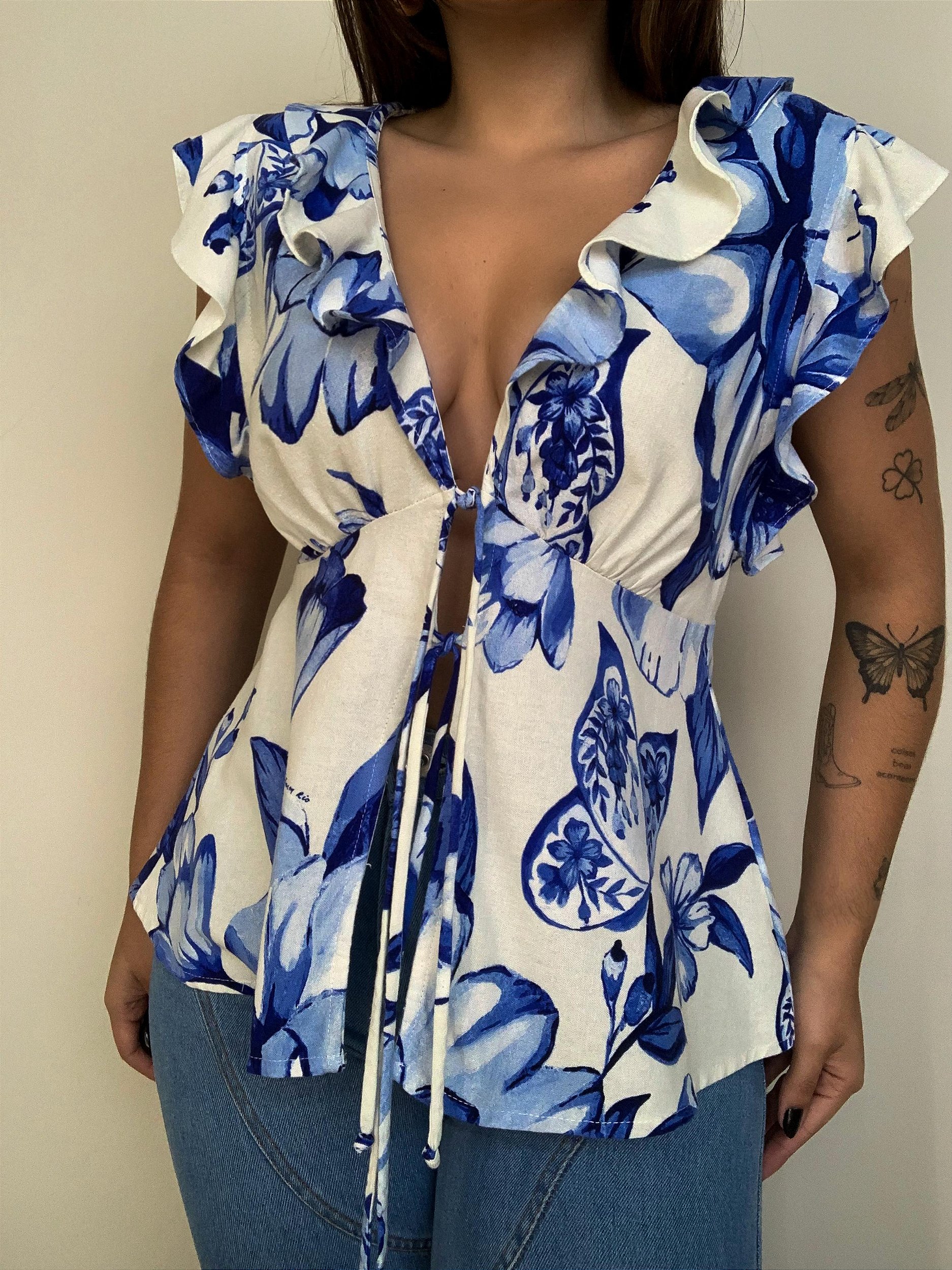 Blusa chita porcelana farm. Possui decote em v profundo com amarração delicada e babados, trazendo movimento e leveza ao visual. Tecido linho.