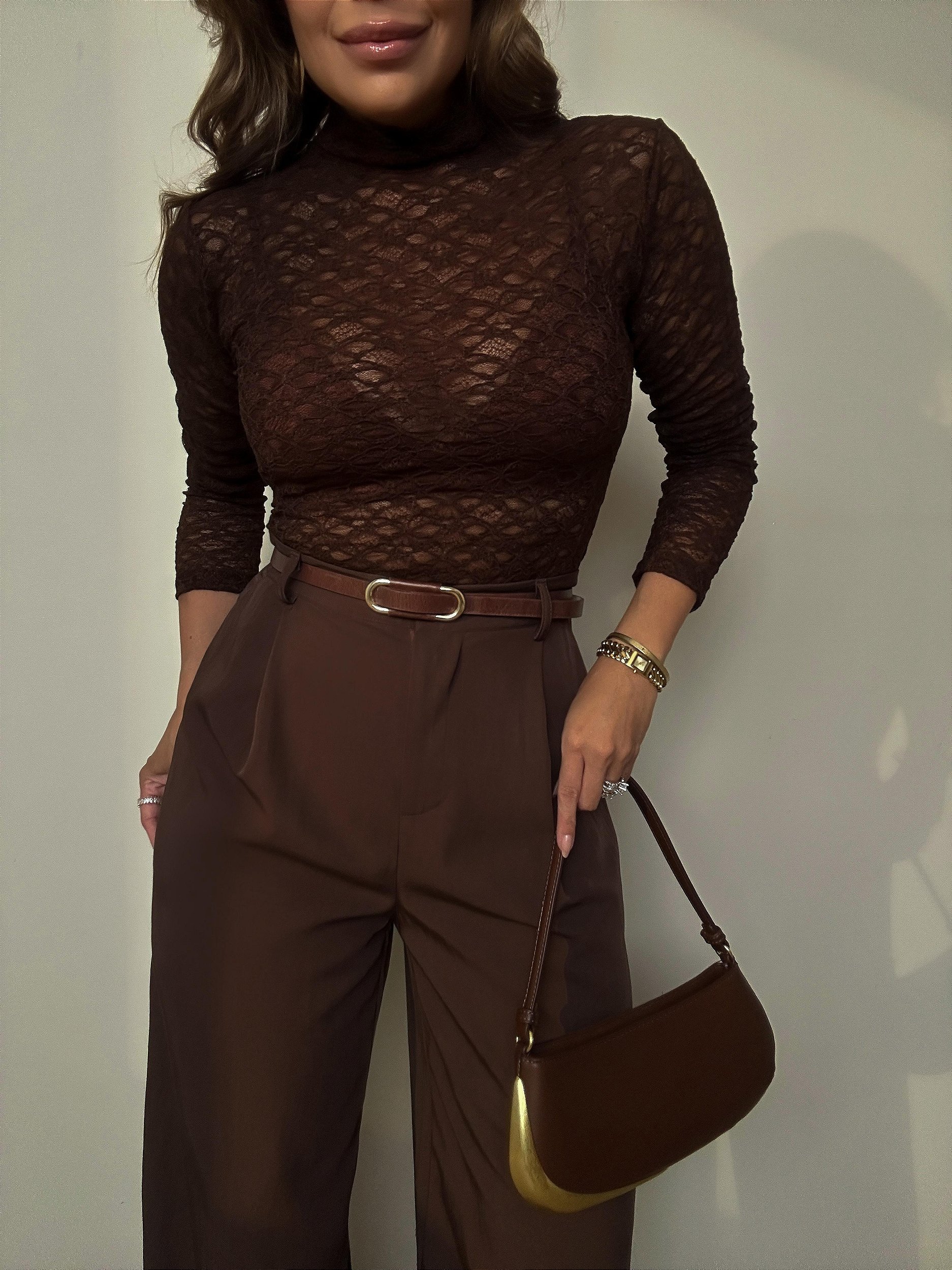 Blusa de renda marrom com modelagem ajustada que valoriza a silhueta com delicadeza e sofisticação. Confeccionada em renda com transparência sutil e padronagem floral, traz um visual romântico e elegante na medida certa. Possui gola alta e mangas longas. Perfeita para composições com top ou lingerie por baixo, ela transita facilmente do look casual ao noturno.