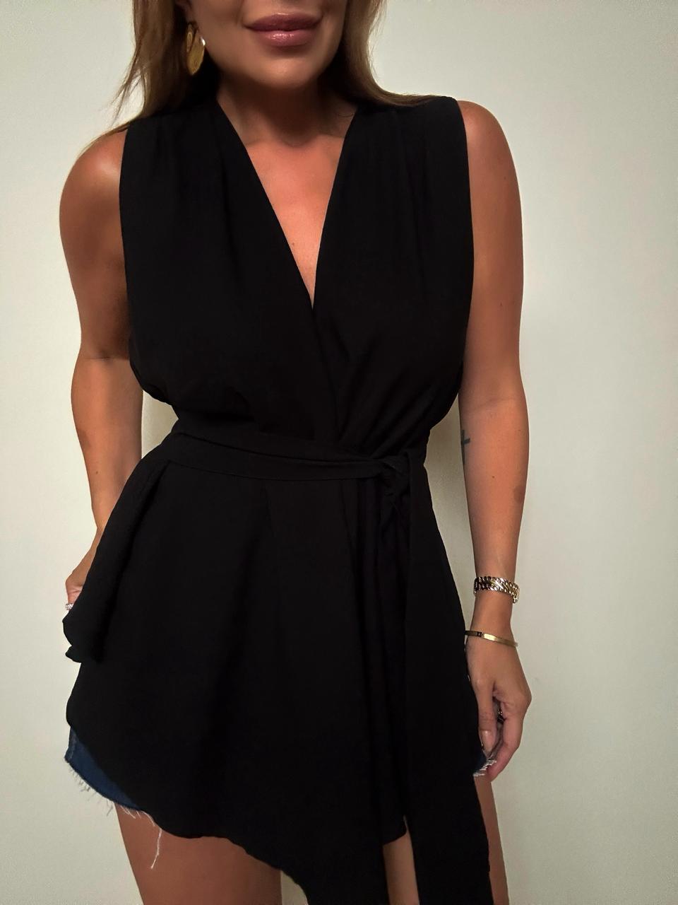 Blusa preta transpassada com amarração que une elegância e feminilidade em uma peça sofisticada. Com decote em V formado pelo transpasse frontal, valoriza o colo na medida certa, trazendo um toque moderno e delicado ao visual. Possui modelagem soltinha com caimento fluido e detalhe de amarração lateral que permite ajuste perfeito ao corpo, além de criar um efeito levemente peplum que alonga e define a silhueta. Tecido liocel.