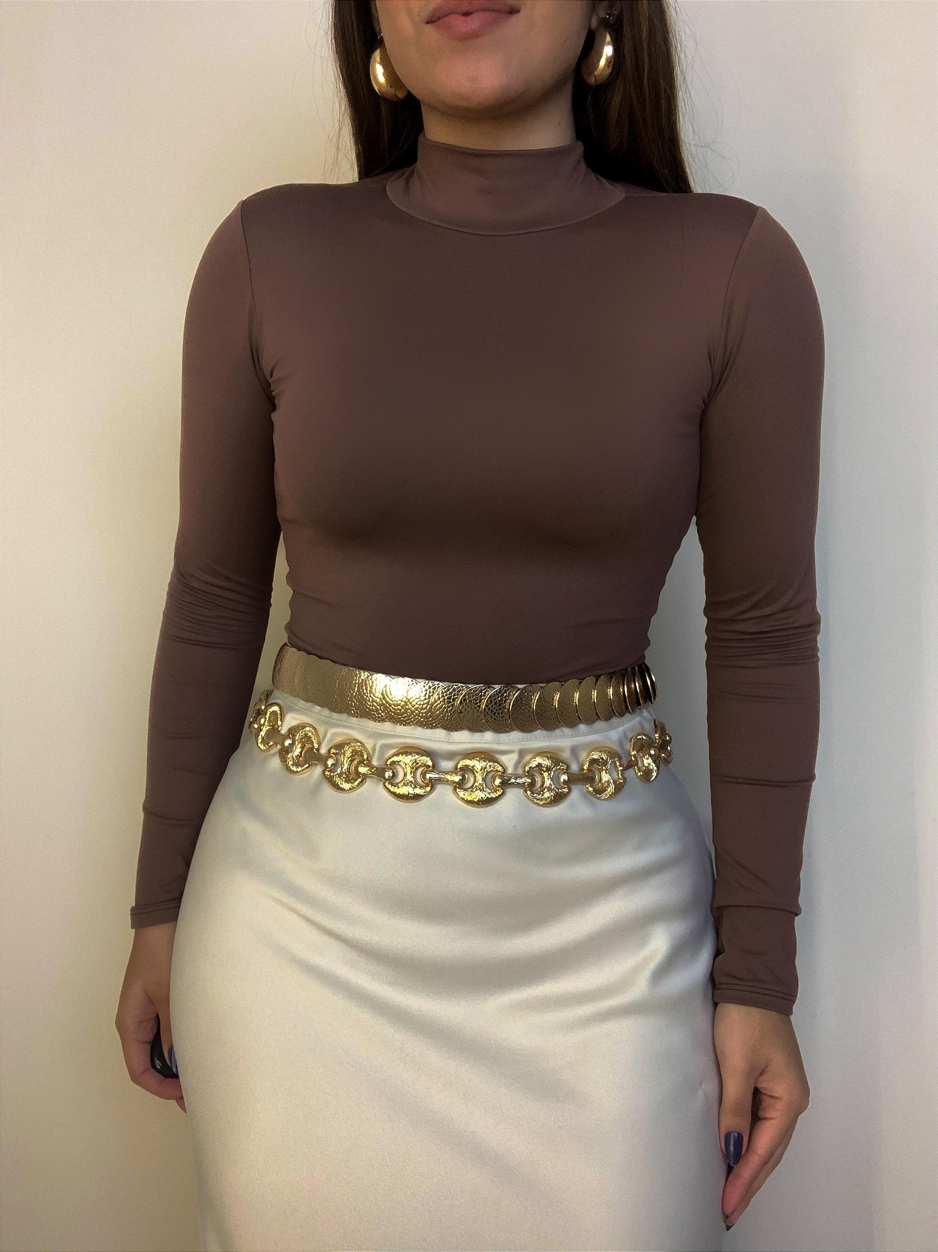 Body marrom gola alta com mangas longas, peça versátil e essencial. Tecido poliamida, fecho de colchete.