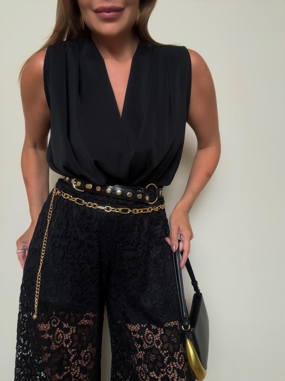 Body preto sofisticado com design elegante e caimento fluido. Confeccionado em tecido leve, possui decote profundo com drapeado frontal que cria um efeito delicado e refinado.