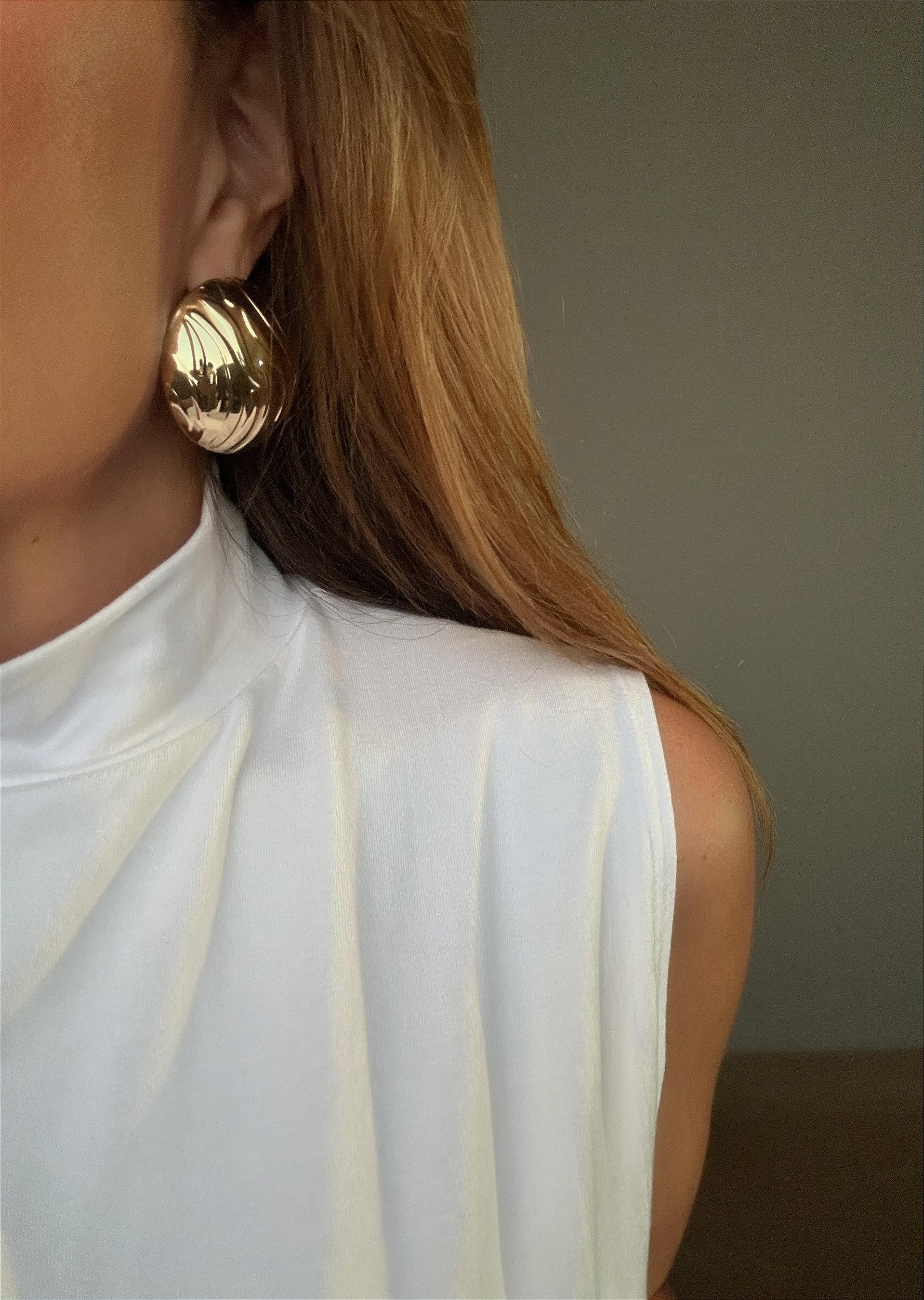 Brinco com design marcante e sofisticado, trazendo um formato arredondado com textura ondulada em relevo que reflete a luz de forma elegante. Com acabamento dourado polido, a peça combina modernidade e atemporalidade, sendo perfeita para elevar qualquer produção.