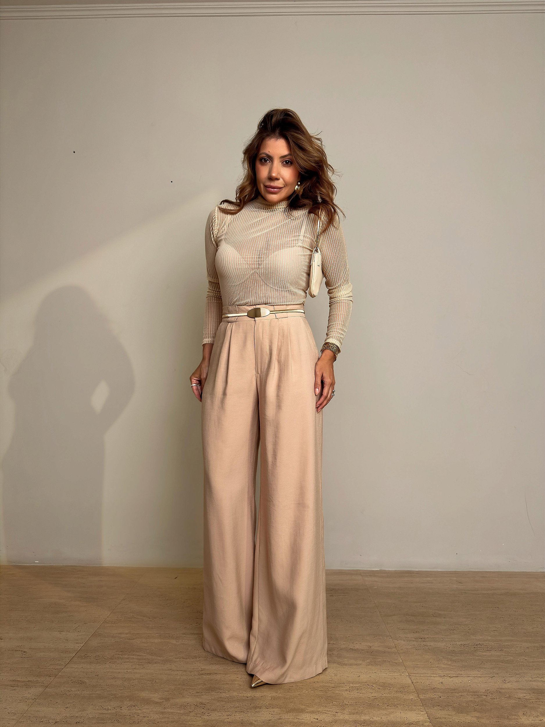 Calça alfaiataria bege de modelagem ampla, com caimento fluido e elegante. Confeccionada em tecido leve, proporciona movimento e conforto ao vestir. Possui cintura alta que valoriza a silhueta e pernas largas que alongam a linha do corpo. Tem passantes e cordinha para amarração.