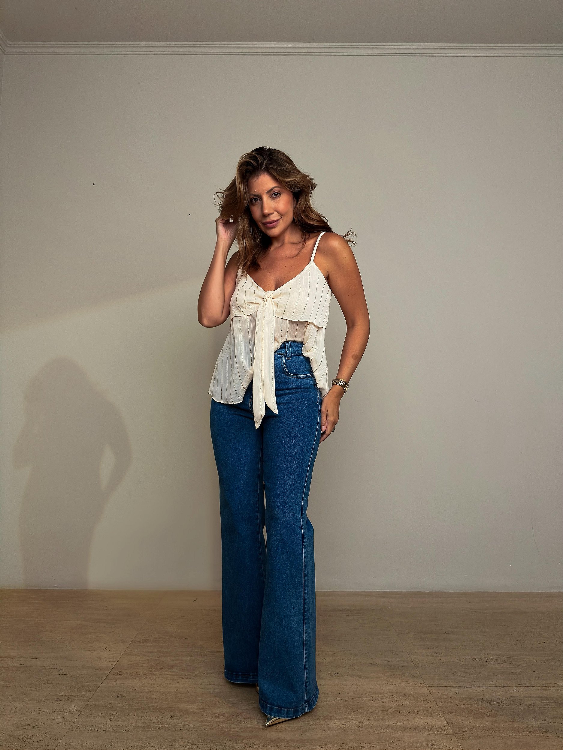 Calça jeans flare de cintura alta, com modelagem que valoriza a silhueta e alonga as pernas. Confeccionada em jeans estruturado com leve elasticidade, proporciona conforto e caimento impecável ao corpo. Possui fechamento por zíper e botão, bolsos funcionais na frente e atrás e barra ampla característica do modelo flare.