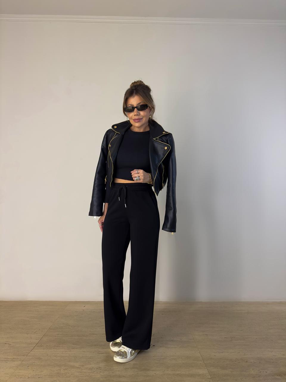 Calça de moletinho preta com modelagem reta e caimento impecável. Confeccionada em tecido macio e confortável, ela possui cintura alta com cós elástico e ajuste por amarração, garantindo um encaixe perfeito ao corpo. O design minimalista e sofisticado permite composições versáteis, do look casual ao mais arrumado.