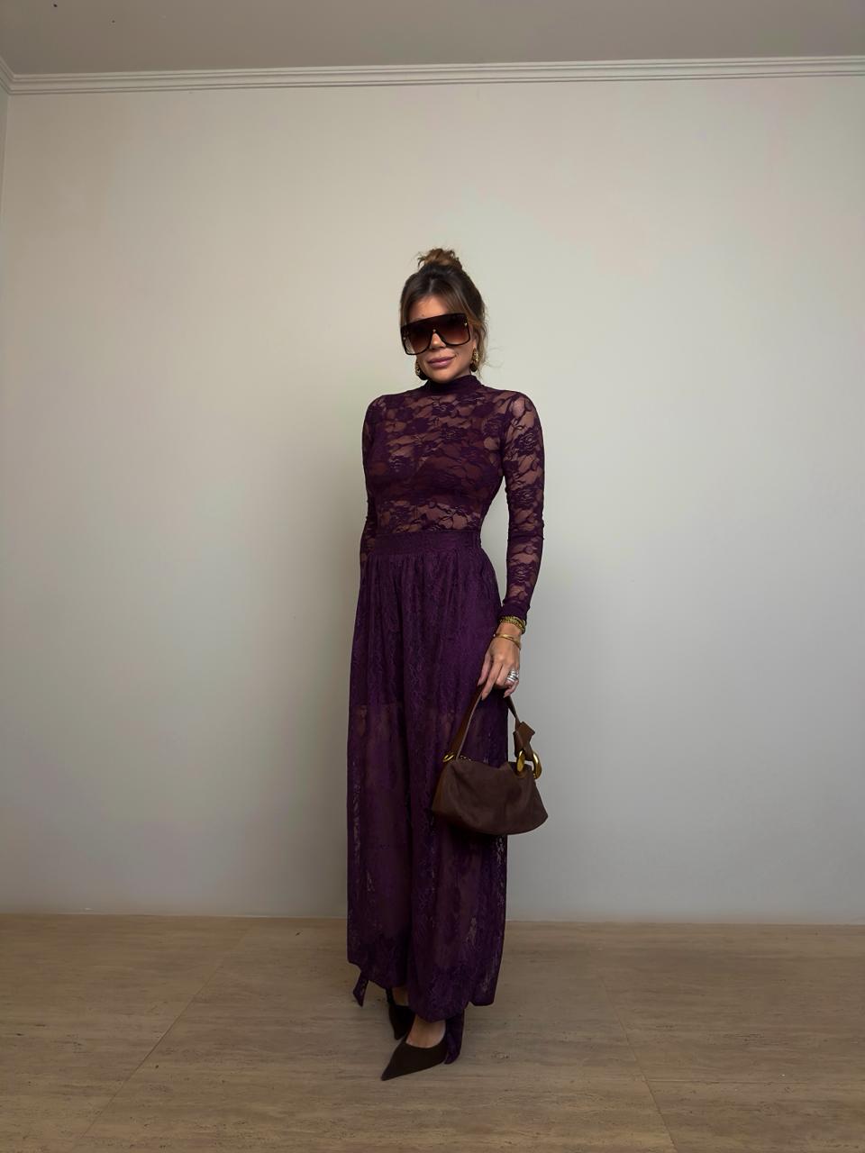 Calça roxo uva estilo aladim em renda que traz leveza e sofisticação para produções cheias de personalidade. Com modelagem ampla e fluida, ela proporciona movimento e conforto, enquanto a transparência sutil da renda adiciona um toque delicado e elegante ao visual. Possui cós confortável com elástico e zíper lateral, e caimento soltinho nas pernas.