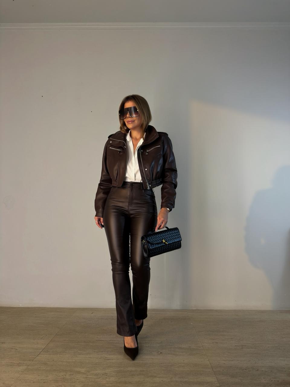 Calça marrom escuro resinada reta que une estilo e atitude em uma peça versátil e sofisticada. Com acabamento que imita o couro, ela valoriza a silhueta com caimento impecável e modelagem reta que alonga as pernas. Possui cintura média, estrutura confortável e toque macio, perfeita para compor looks modernos, do casual ao mais elegante. Tem fechamento por botão e zíper, além de bolsos funcionais na frente e atrás.