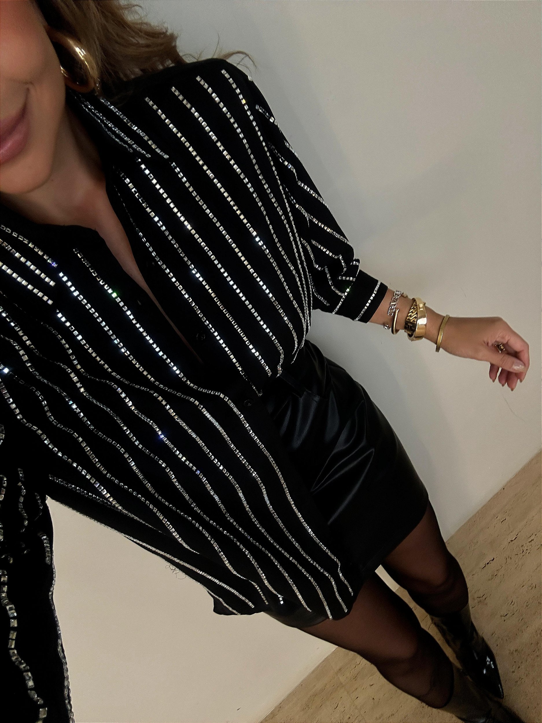 Camisa preta com brilhos prata que traduz elegância e atitude na medida certa. Com listras verticais em pontos luminosos, a peça valoriza a silhueta e cria um efeito sofisticado e moderno. Possui gola clássica e fechamento frontal por botões, garantindo versatilidade para composições que vão do casual chic ao look noturno.