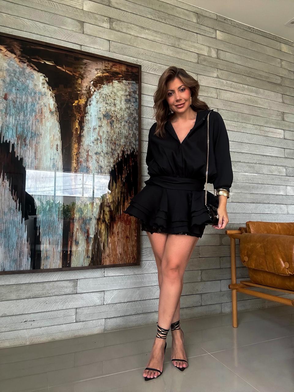Chemise preta com design elegante e delicado. Possui mangas longas levemente bufantes e punhos suaves, trazendo um toque romântico à peça. A saia curta com babados garante movimento e leveza, enquanto a modelagem acinturada valoriza a silhueta. Confeccionada em tecido fluido, é perfeita para compor produções sofisticadas e versáteis.