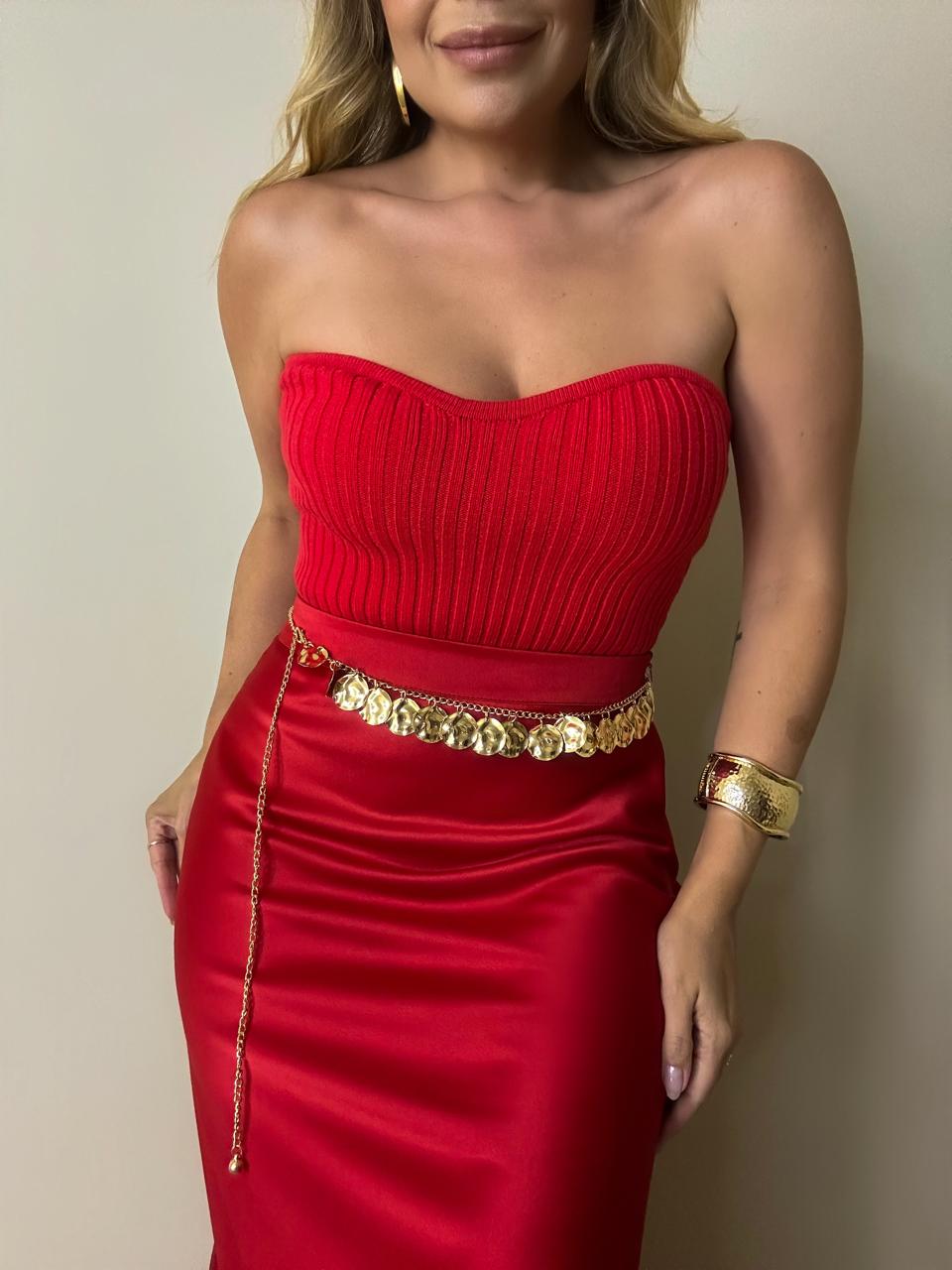 Cinto de moedas texturizadas, com acabamento dourado e design delicado que valoriza a cintura com elegância. As pequenas medalhas possuem relevo sutil, criando um efeito sofisticado e cheio de movimento. Possui ajuste e caimento perfeito no corpo.