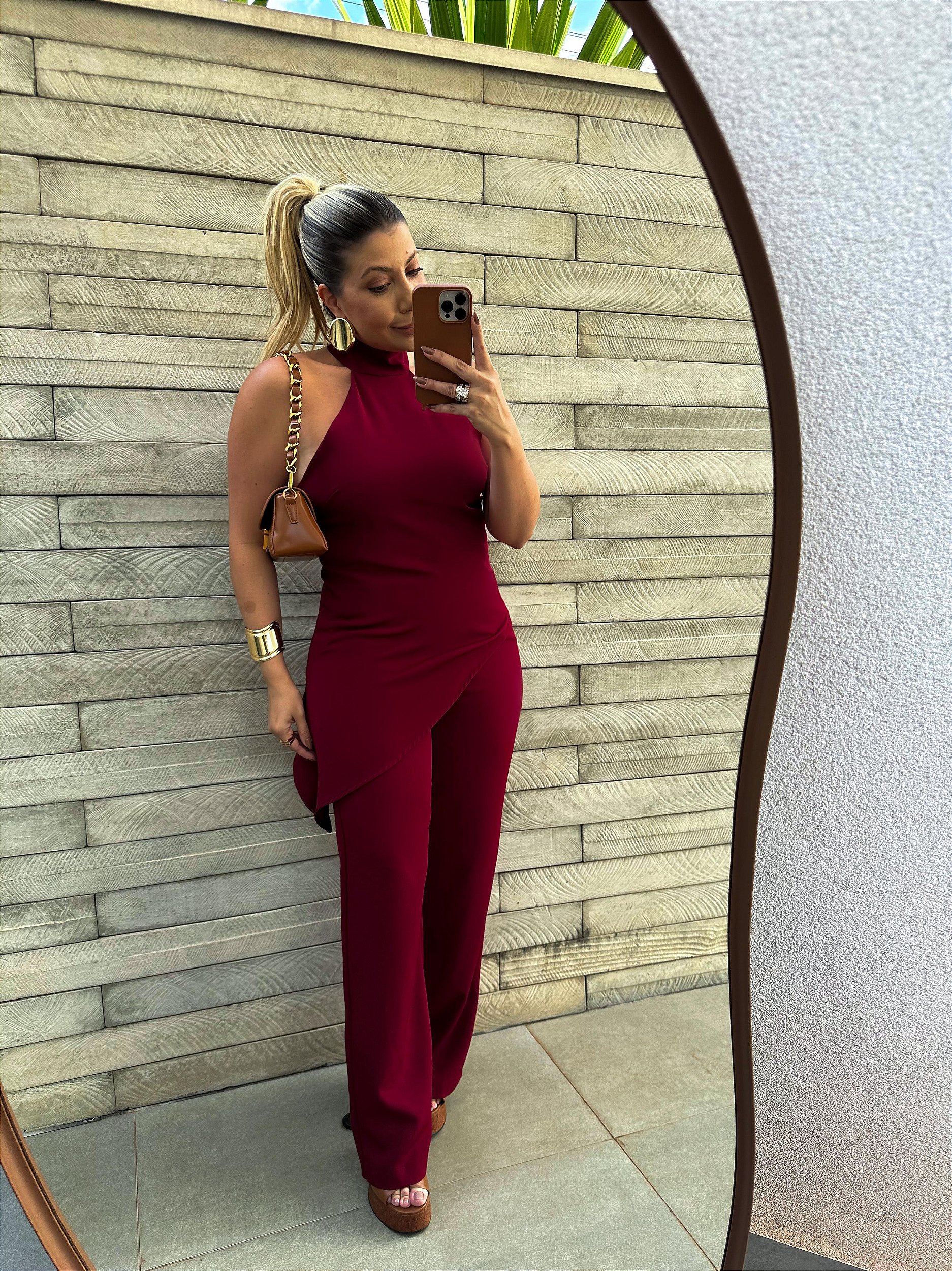 Conjunto alfaiataria vermelho com recorte assimétrico, moderno e sofisticado. A peça é composta por blusa gola alta com decote cava entrada e recorte assimétrico na barra, tem zíper nas costas. Calça de cintura alta com caimento reto, fechamento frontal por botão e zíper. Tecido crepe spandex.