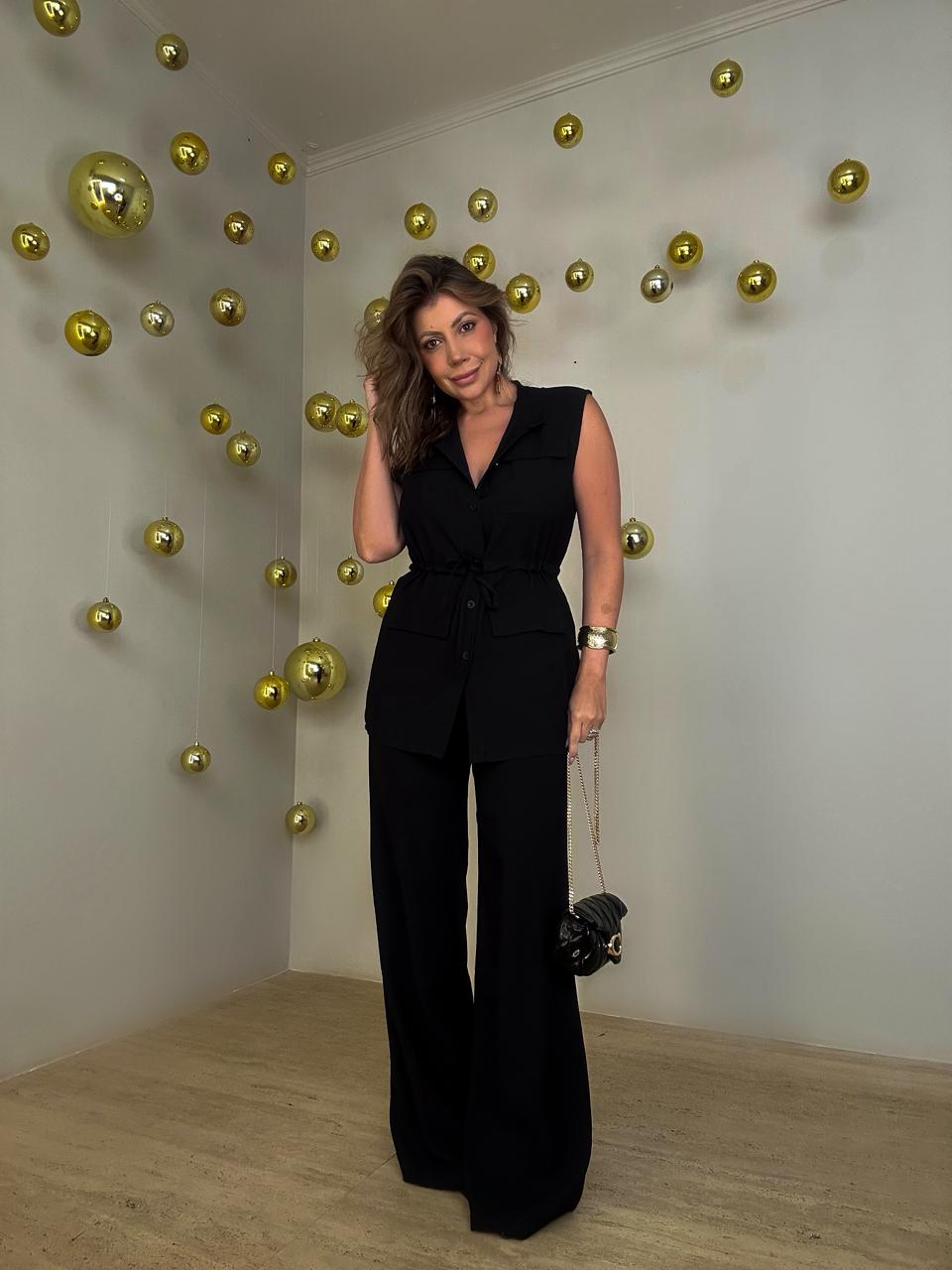 Conjunto preto elegante e moderno, composto por parka sem mangas e calça de modelagem ampla, confeccionado em liocel encorpado e com ótimo caimento. A parka possui bolsos e amarração frontal que valoriza a silhueta, trazendo um toque sofisticado e feminino. A calça de cintura alta com elástico alonga a silhueta e garante conforto e fluidez ao look.