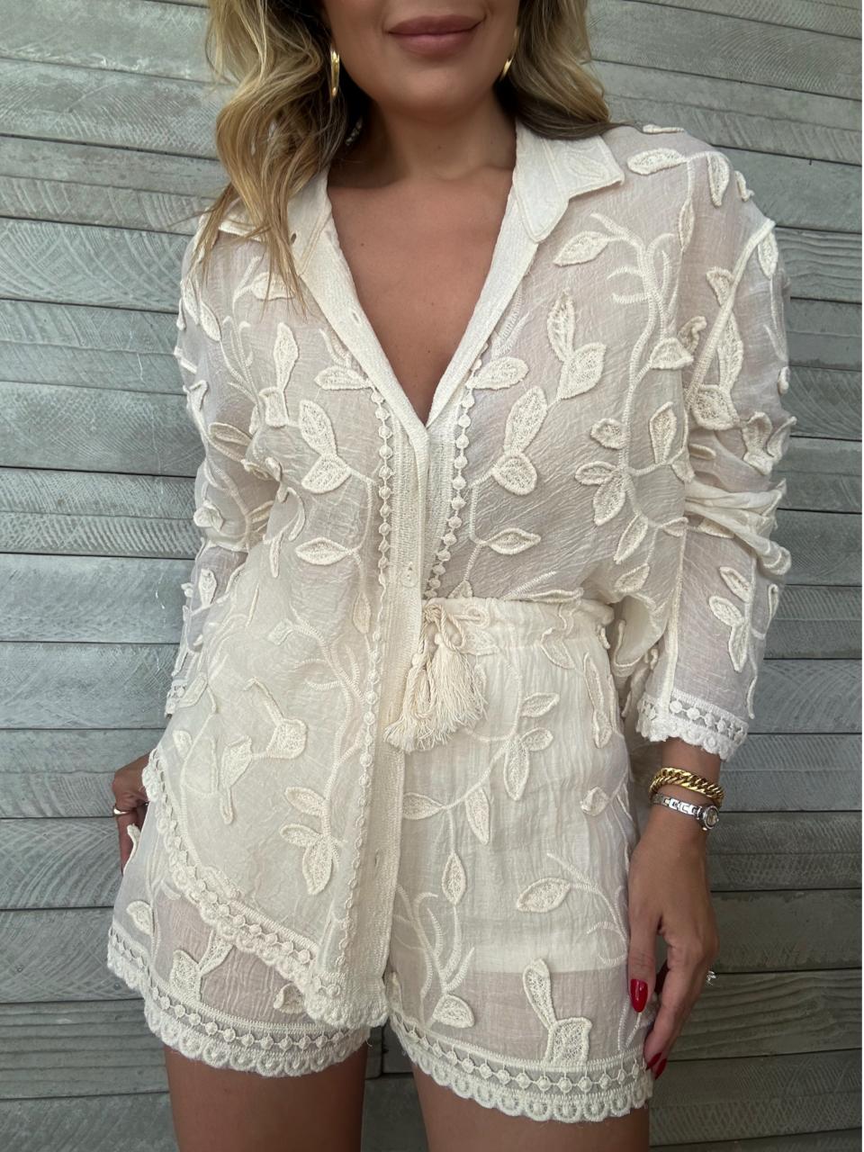 Conjunto bege areia em laise bordada, perfeito para produções leves, elegantes e super femininas. A peça combina sofisticação e frescor, trazendo uma textura rica em detalhes com desenhos florais que valorizam qualquer look. A camisa possui modelagem soltinha, transparência suave e botões frontais. O short segue o mesmo trabalho de bordado, possui elástico no cós.