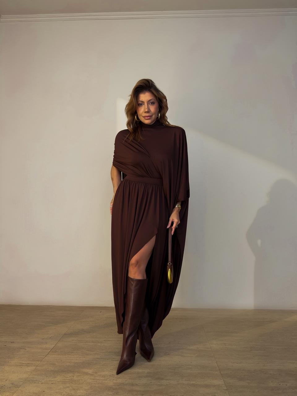 Conjunto sofisticado em tom marrom com gola alta e ombreiras, composto por vestido de modelagem fluida com sobreposição estilo capa que traz elegância e movimento ao look. O design assimétrico valoriza a silhueta, com drapeados estratégicos e fenda frontal que adiciona um toque moderno e sensual na medida certa. Tecido poliamida.
