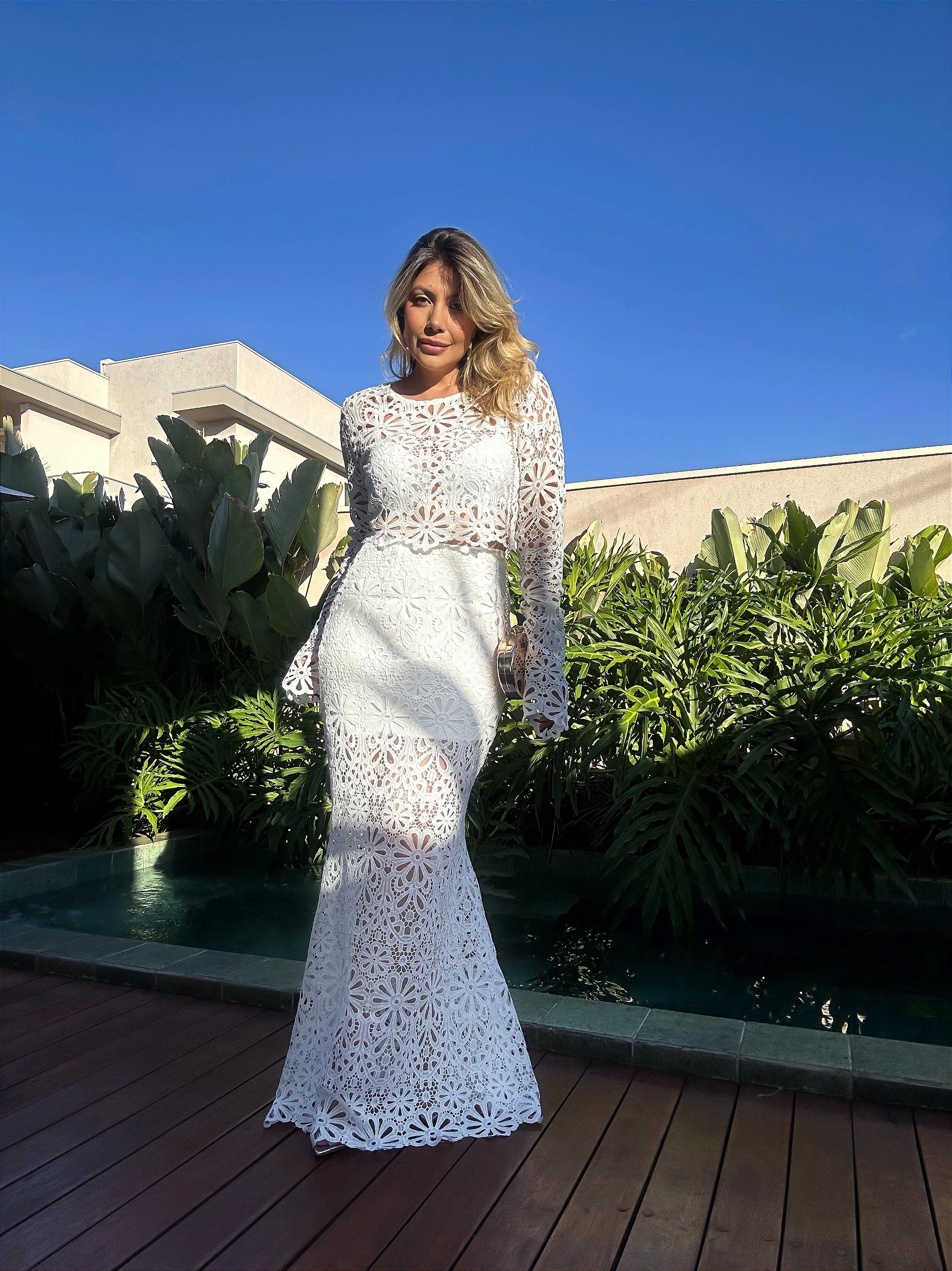 Conjunto branco deslumbrante, feito em renda guipir trabalhada que valoriza cada detalhe do look. O cropped de manga longa levemente flare traz transparência delicada, enquanto a saia longa ajustada até o quadril e com leve abertura no caimento, cria uma silhueta sofisticada e feminina. Tem fechamento por zíper.