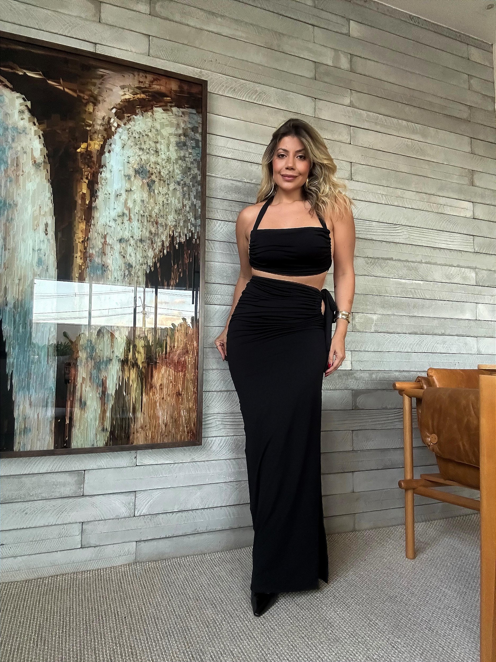 Conjunto preto elegante e super moderno, composto por top frente única com amarração nas costas. A saia longa com recorte valoriza a silhueta, e a amarração na cintura traz um toque extra de charme. A fenda lateral traz sensualidade na medida certa, deixando o look ainda mais poderoso. Confeccionado em poliamida.