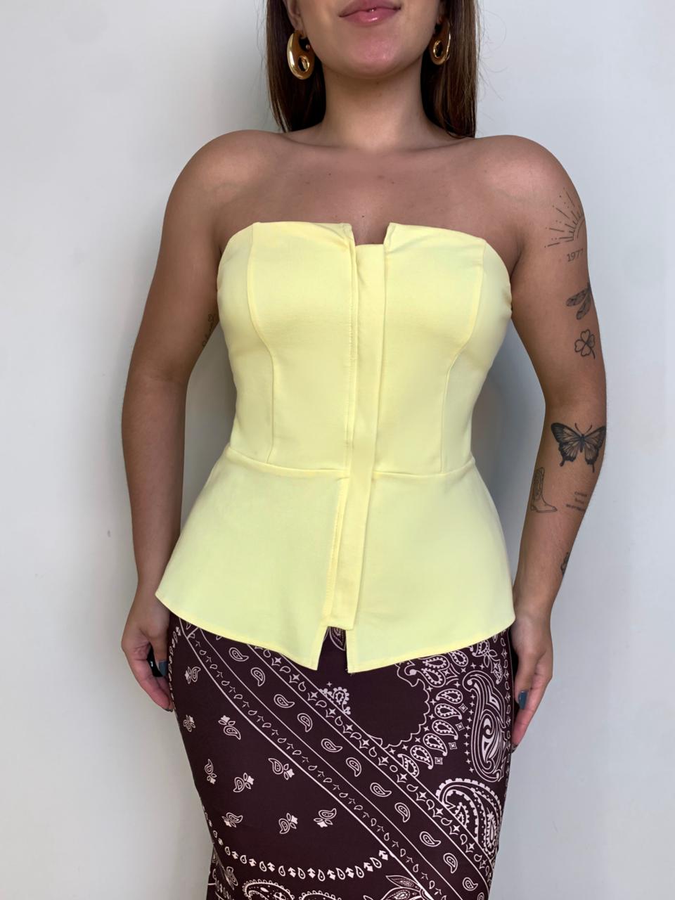 Corselet alfaiataria amarelo com modelagem estruturada que valoriza o busto e a cintura, é a peça perfeita para quem ama unir sofisticação e conforto em um único look. Na parte frontal, possui zíper embutido. Já nas costas, o lastex proporciona ajuste perfeito ao corpo. Confeccionado em tecido ponto roma, tem forro no busto.