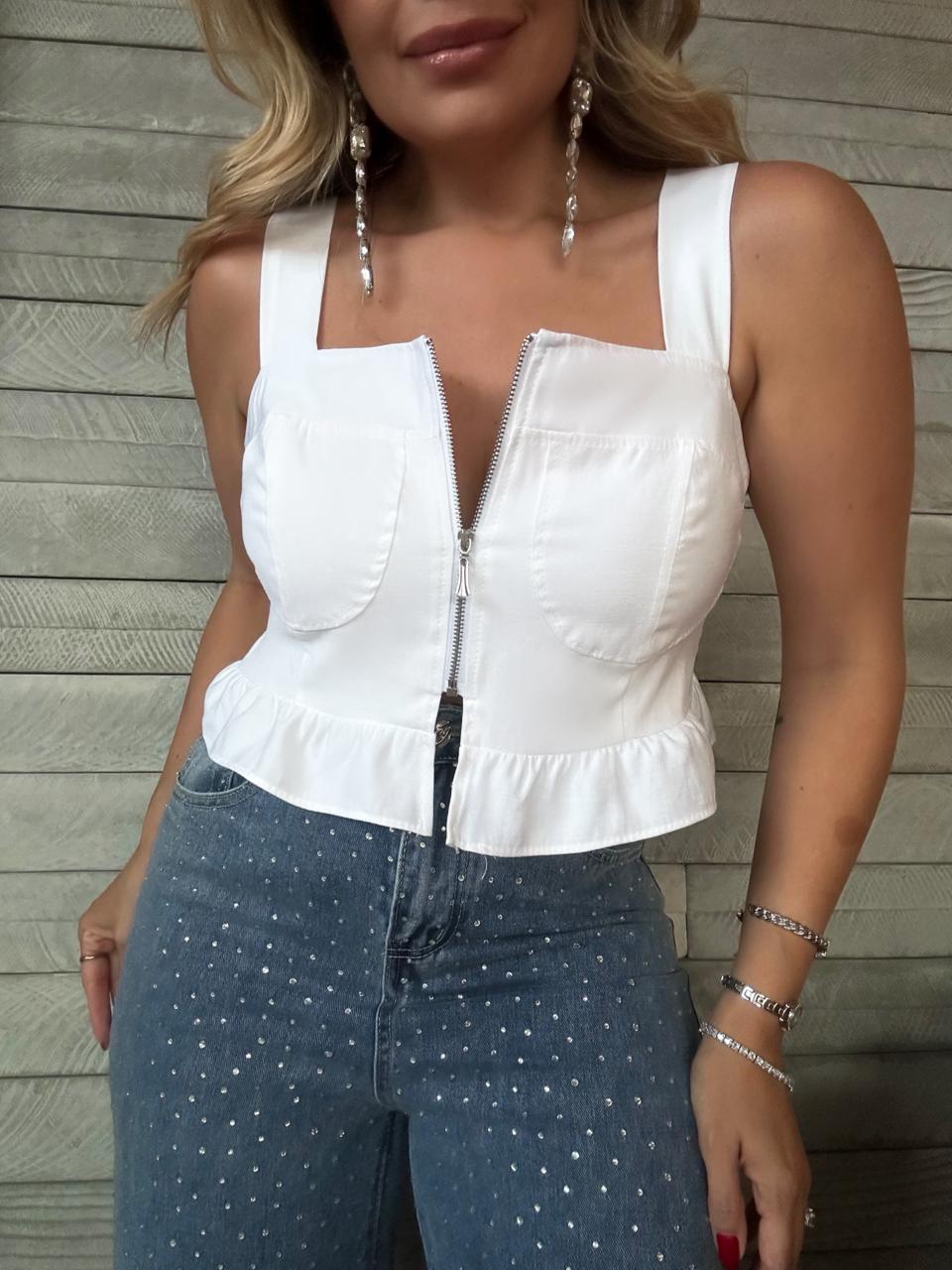 Cropped branco com modelagem estruturada que valoriza a silhueta e traz um visual moderno e poderoso. O decote quadrado e as alças largas conferem elegância, enquanto o zíper frontal adiciona um toque contemporâneo. A barra com babado entrega feminilidade e movimento, tornando a peça perfeita para compor looks marcantes.