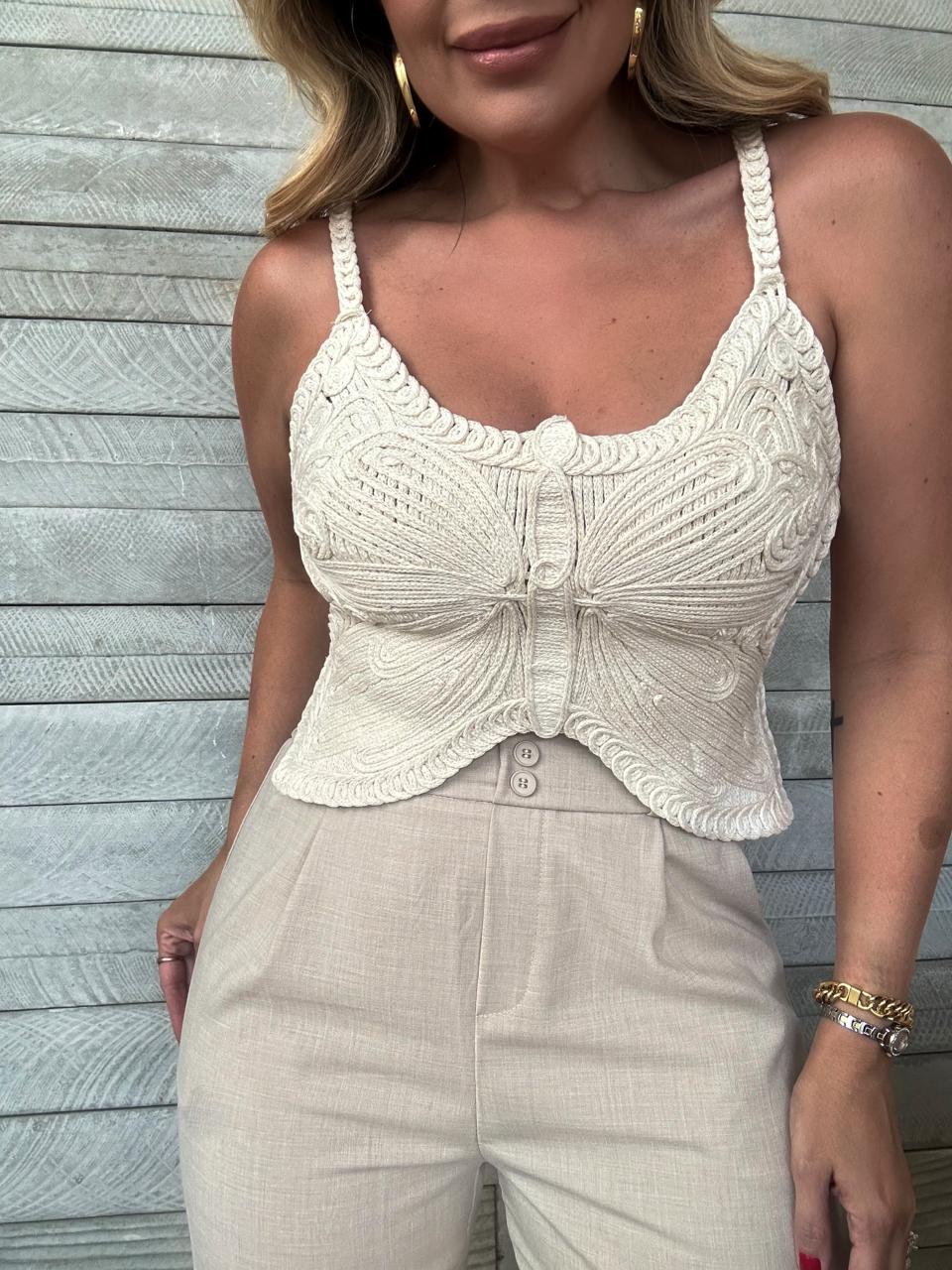 Cropped bege areia em formato de borboleta, trazendo um visual super delicado. O modelo possui busto estruturado, recortes que remetem às asas e acabamento artesanal que destaca o desenho. As costas totalmente abertas garantem um toque ousado e fresco, perfeito para looks de verão ou produções despojadas com jeans.