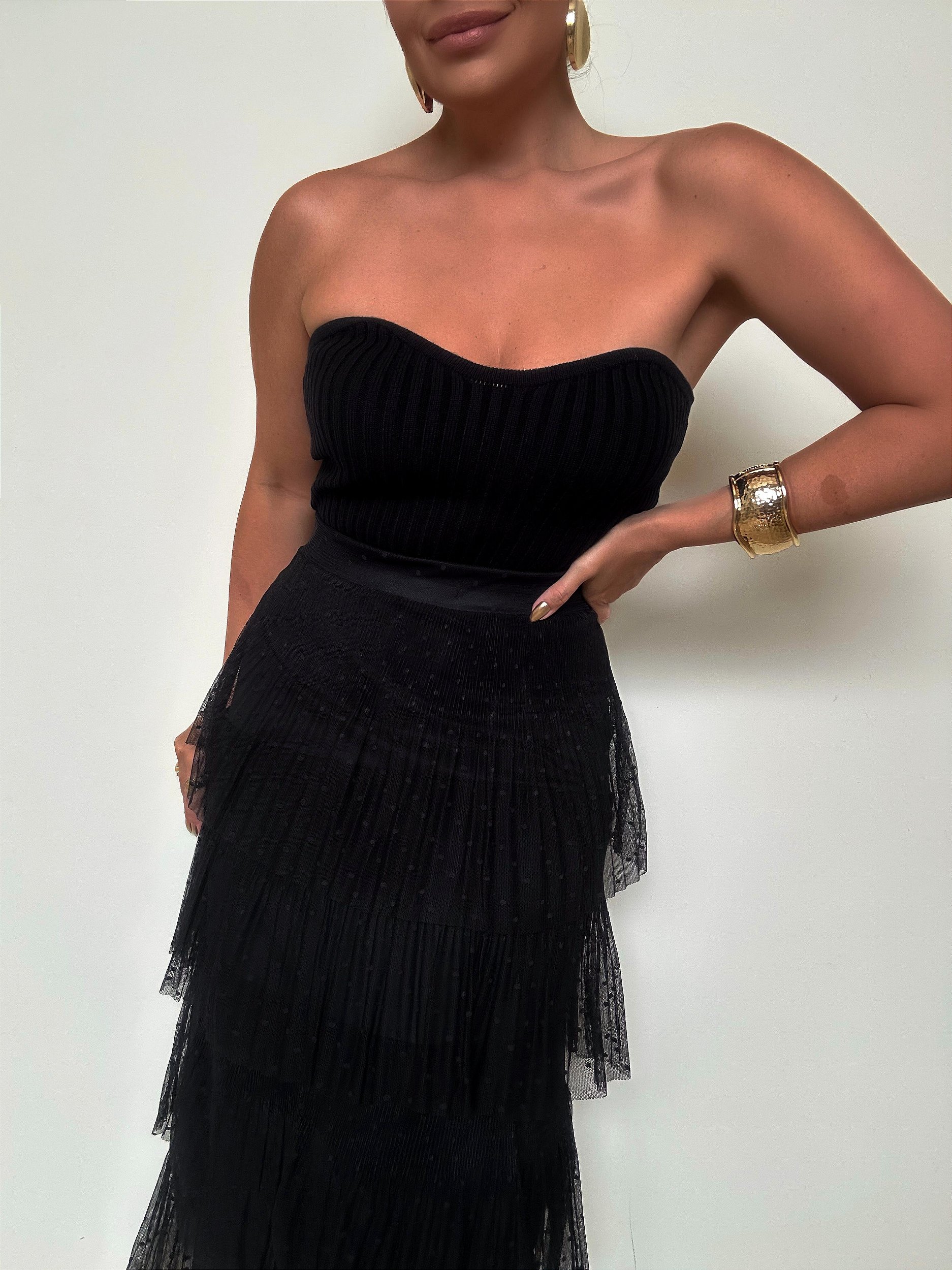 Cropped preto de tricot modal é a combinação perfeita de conforto e estilo. Com seu design tomara que caia, ele destaca a parte superior do corpo de maneira elegante e moderna. Peça prática e chique para diversas ocasiões.