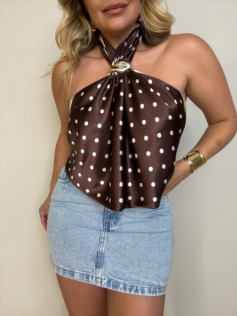 Lenço de cetim chocolate com estampa clássica de poás champanhe e detalhe em barra geométrica. O lenço é um charmoso acessório que valoriza a silhueta e adiciona um toque de feminilidade e estilo clássico à composição.
