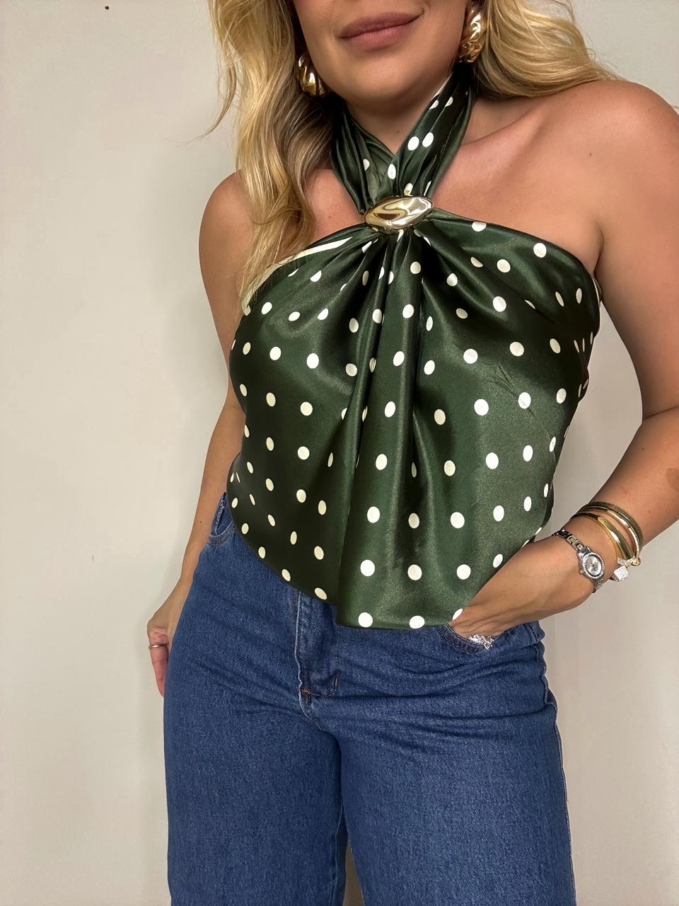 Lenço de cetim verde com estampa clássica de poás champanhe e detalhe em barra geométrica. O lenço é um charmoso acessório que valoriza a silhueta e adiciona um toque de feminilidade e estilo clássico à composição.