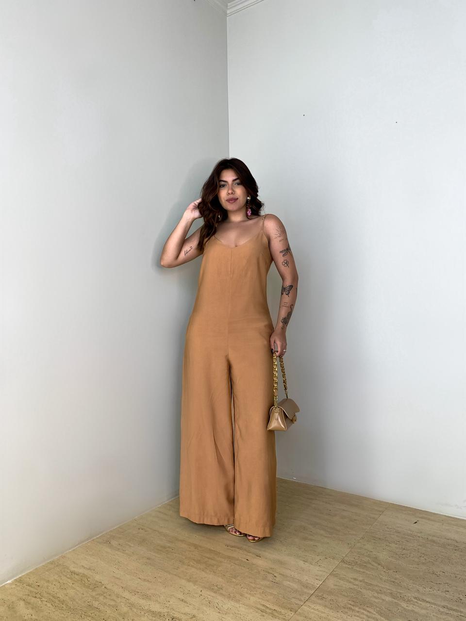 O macacão camel é a escolha perfeita para quem busca elegância com leveza. Confeccionado em tecido liocel encorpado fluido e leve, possui bolsos laterais, fechamento por ziper atrás e modelagem ampla que garante conforto e movimento. O decote arredondado e as alças finas ajustáveis trazem delicadeza e valorizam o colo, enquanto o caimento solto e alongado confere um visual sofisticado e moderno.