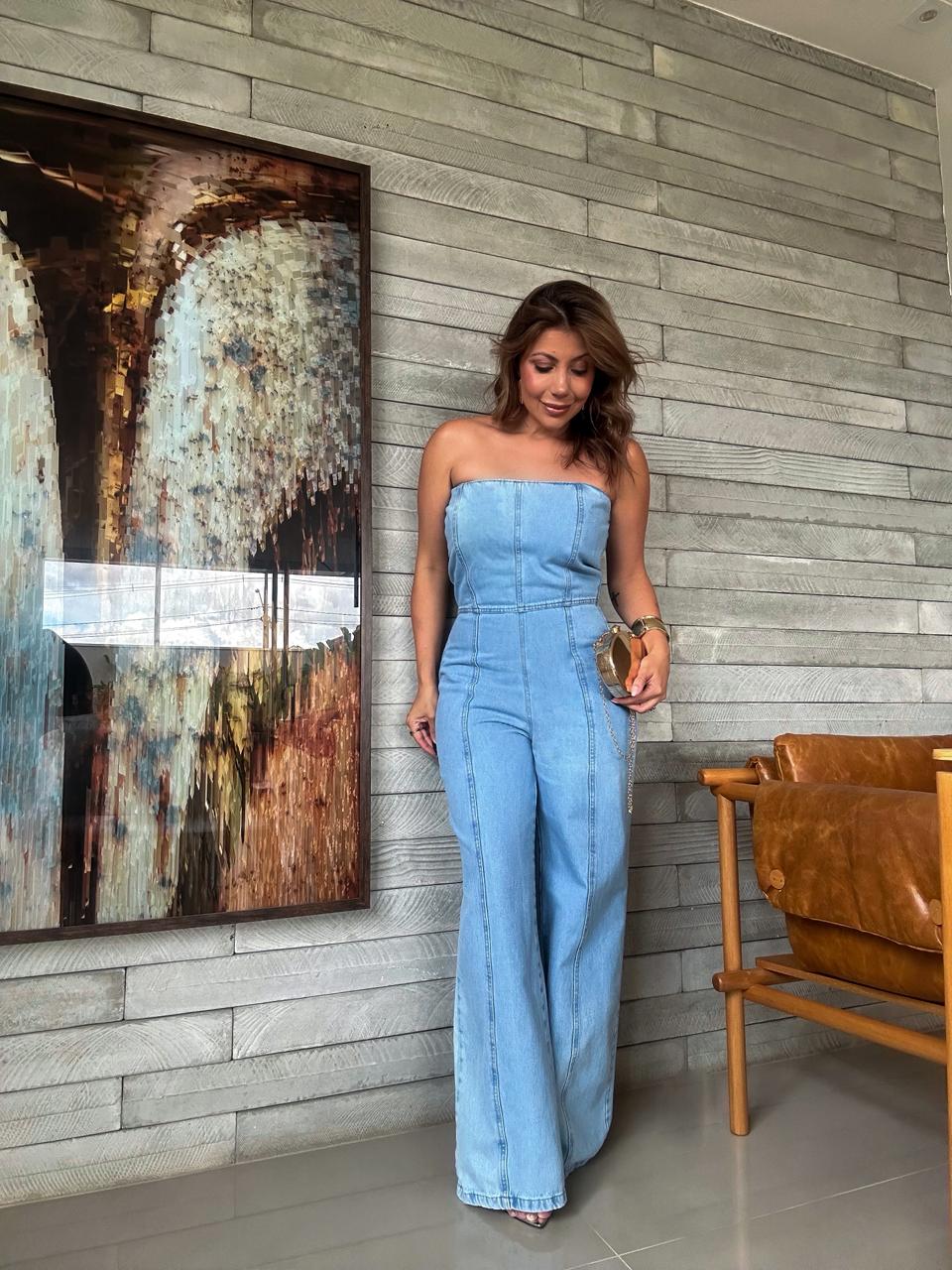 Macacão jeans claro com modelagem elegante, perfeito para quem busca praticidade sem abrir mão do estilo. Possui busto estruturado tomara que caia, a calça de pernas retas e amplas alonga a silhueta, trazendo um visual versátil e sofisticado. Tem zíper e bolsos traseiros.