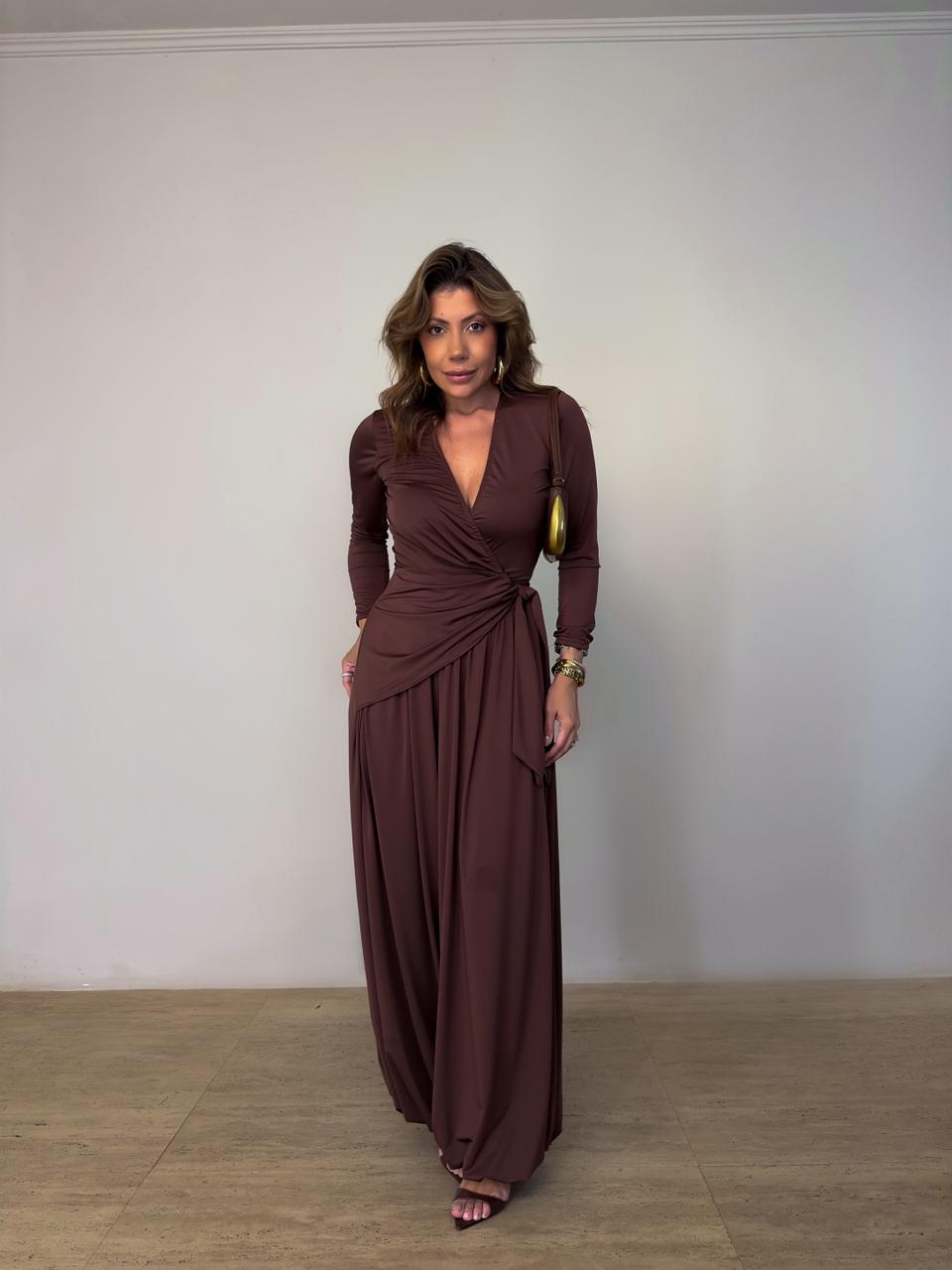 Macacão marrom longo sofisticado com modelagem transpassada que valoriza a silhueta de forma elegante. Possui mangas longas e decote em V, trazendo um toque moderno e alongando o colo. A cintura marcada com detalhe drapeado e amarração cria um caimento impecável, enquanto a calça ampla garante movimento e leveza ao look. Confeccionado em poliamida.