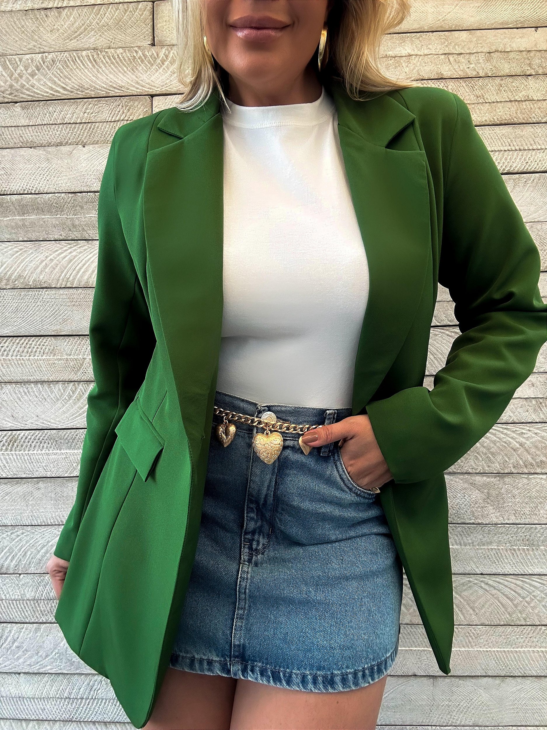 Maxi blazer alfaiataria verde folha, chique e elegante com bolsos falsos frontais. Tem gola e lapela acompanhando o decote com botão caseado no centro, mangas longas. Tecido crepe spandex, peça toda forrada.