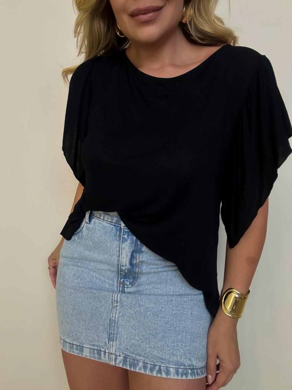 Maxi Blusa Preta com mangas curtas de babados. Possui barra arredondada, mais curta na frente e comprida atrás. Tecido malha.