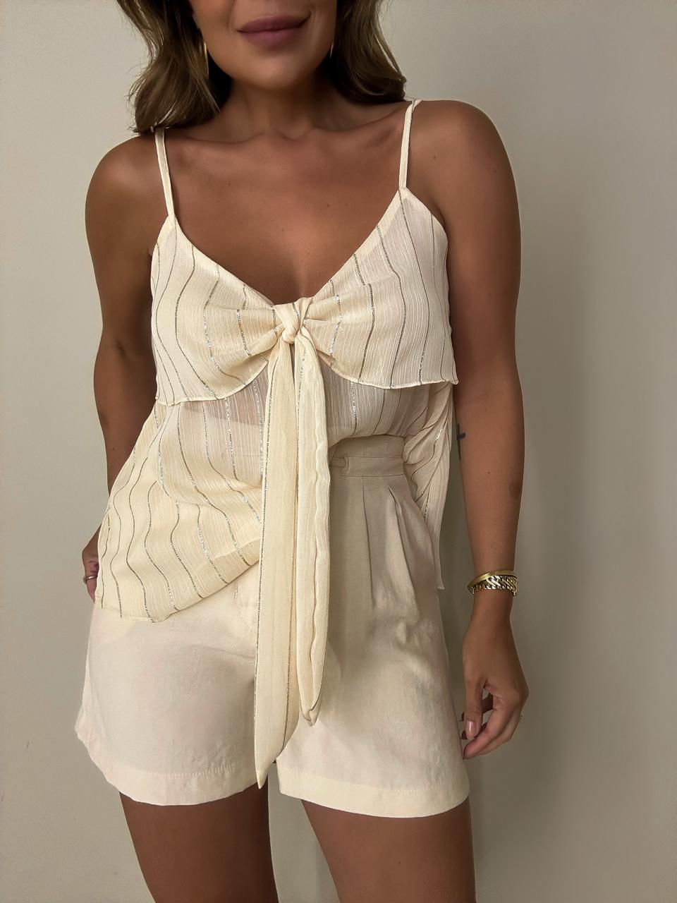 Regata bege creme delicada e super feminina com fios dourados, perfeita para compor looks leves e elegantes. Confeccionada em tecido fluido, ela possui alcinhas finas e decote com amarração frontal que valoriza o colo com charme e sofisticação. O detalhe em laço traz um toque romântico, enquanto o caimento soltinho garante conforto e movimento.