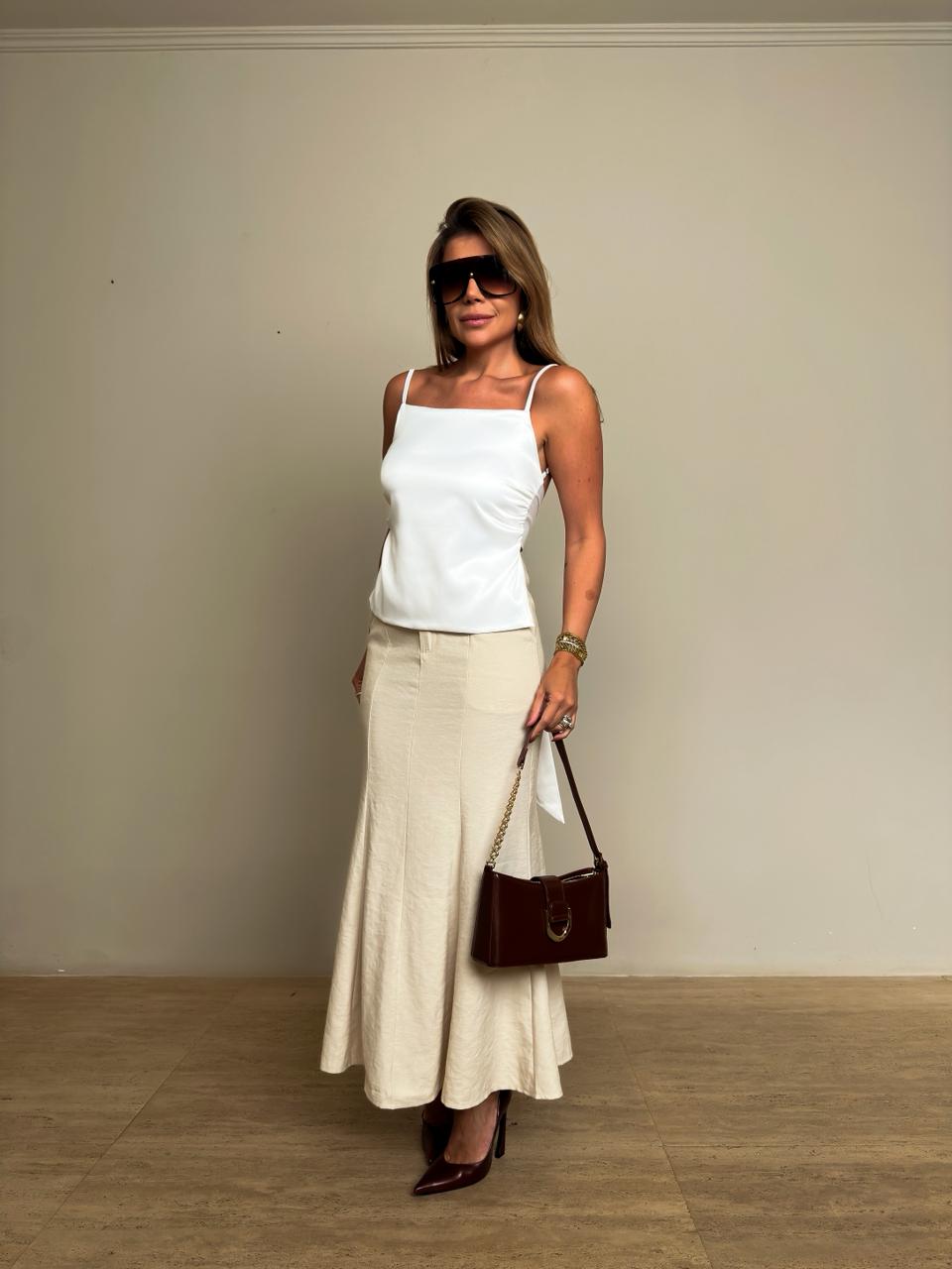 Blusa branca de alças finas com design elegante e minimalista, perfeita para compor produções sofisticadas. Confeccionada em tecido acetinado, possui toque macio e caimento leve que valoriza a silhueta com delicadeza. O grande destaque da peça está nas costas totalmente abertas, com amarração que permite ajuste ao corpo e acrescenta um toque sensual e feminino ao visual.
