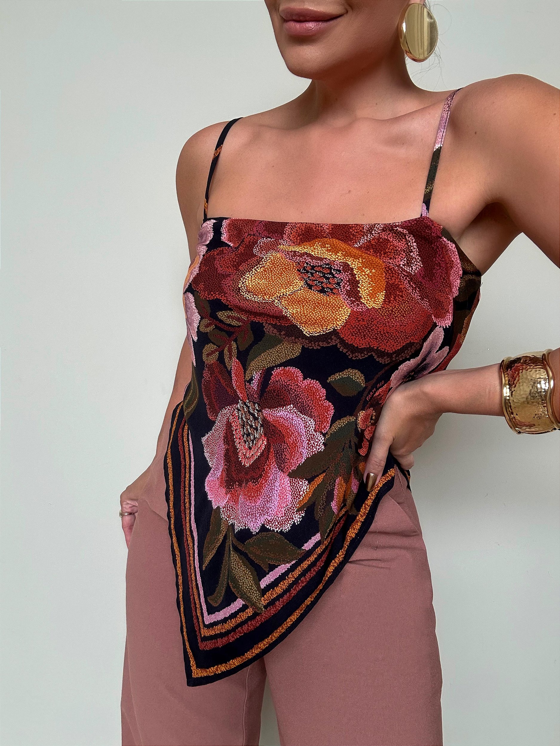 Regata farm com estampa floral sofisticada e cheia de personalidade. O modelo apresenta decote reto e modelagem assimétrica com barra em bico, trazendo um visual moderno e elegante. Confeccionada em tecido leve e fluido, proporciona caimento delicado e confortável.