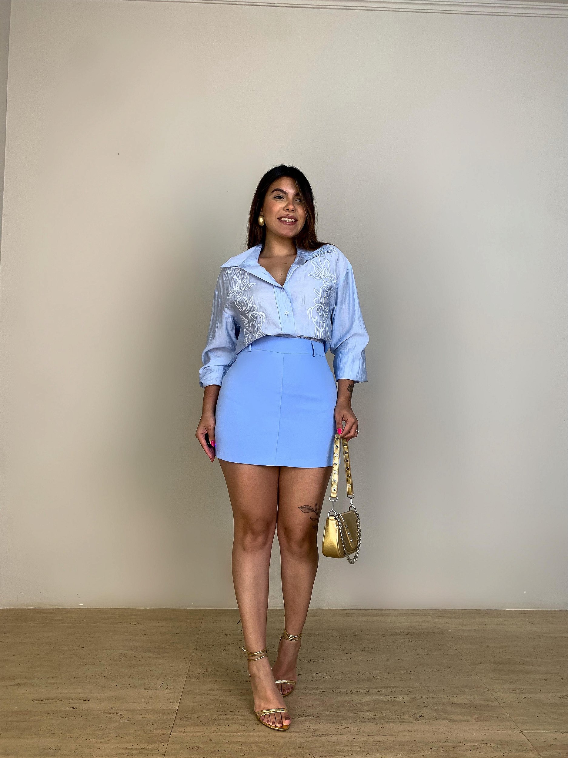 Saia curta alfaiataria azul claro minimalista e elegante com modelagem reta e cintura alta. Tecido crepe spandex, tem forro de shortinho. Fechamento traseiro por zíper.