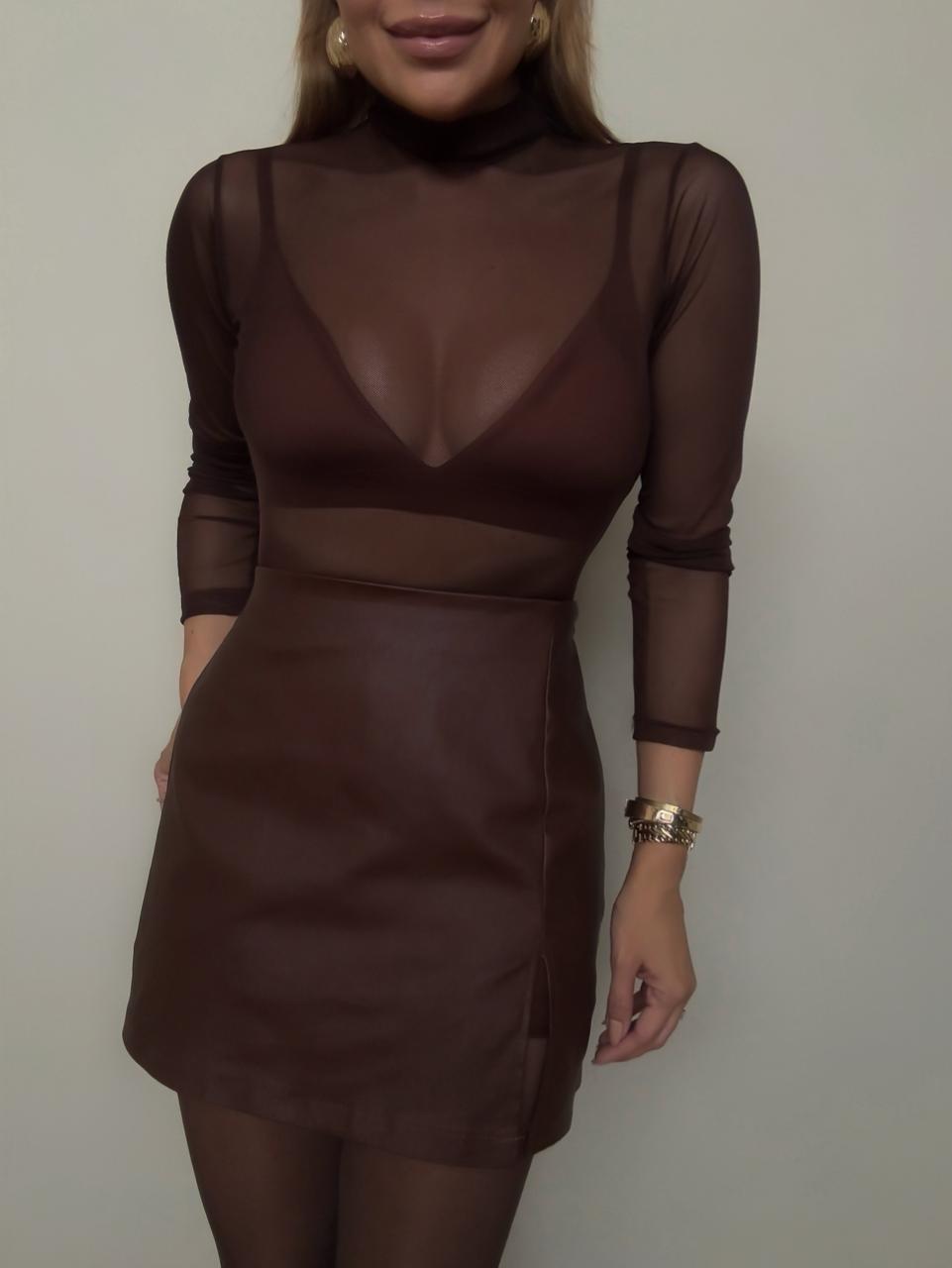 Saia resinada marrom com acabamento sofisticado, perfeita para composições modernas e elegantes. Possui modelagem reta que valoriza a silhueta, cós alto que garante conforto e caimento impecável. Tem shortinho por baixo e zíper lateral.