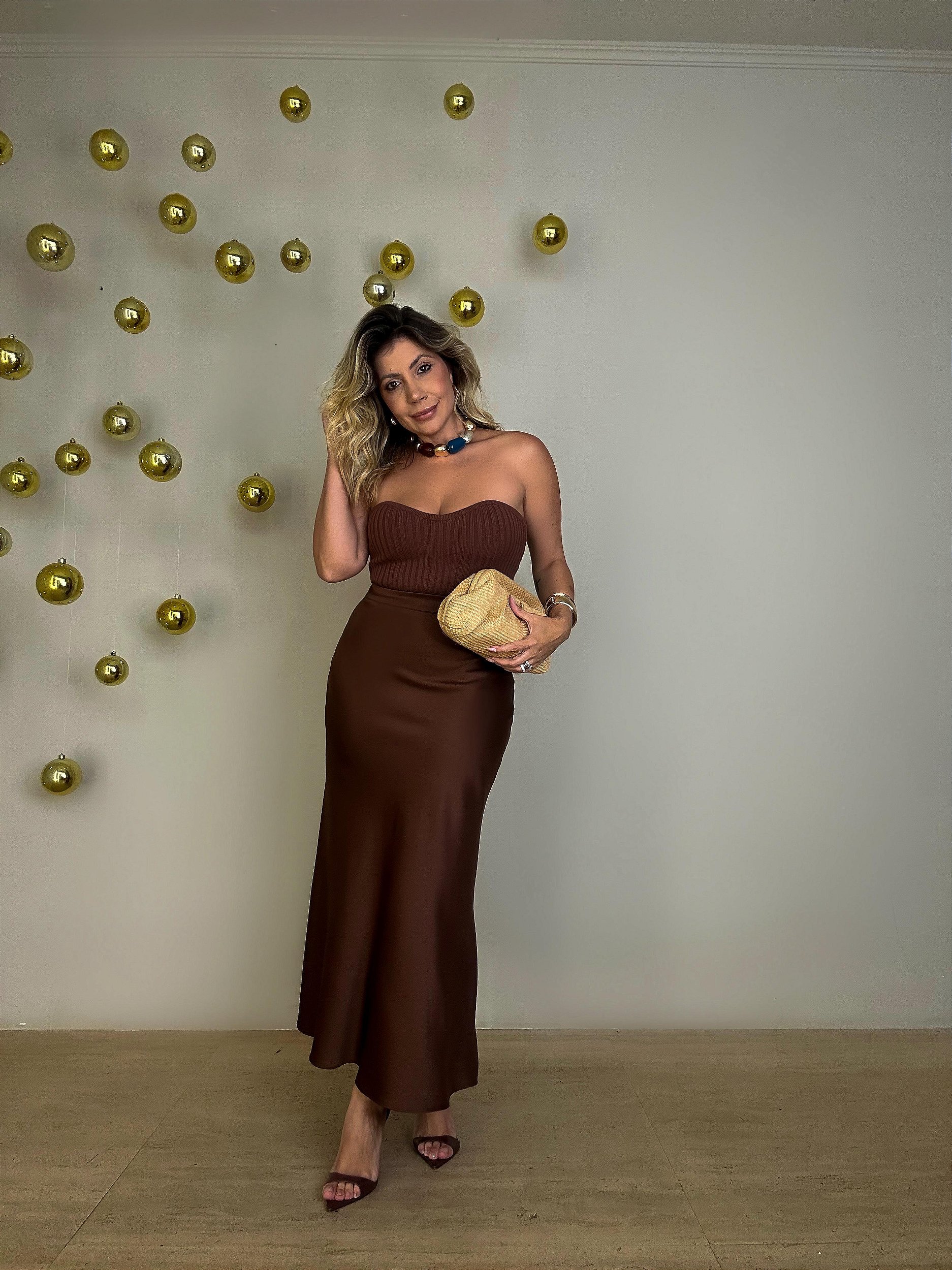 Saia de cetim marrom com tecido brilhante e fluido que cria um visual sofisticado e elegante. Com um corte midi e justo, ela se ajusta suavemente ao corpo, acentuando as curvas de forma delicada. Tem zíper lateral. Ideal para ocasiões especiais ou para um look refinado no dia a dia, essa saia de cetim é perfeita para quem busca uma peça versátil e estilosa.