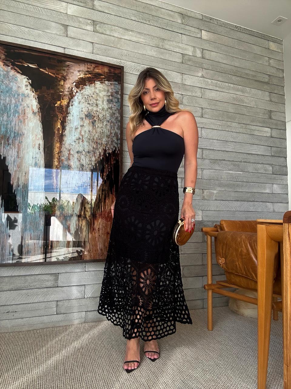 Saia de crochê preta super delicada, perfeita para ocasiões especiais ou para quem deseja adicionar um elemento de elegância ao seu estilo. Com um design em tramas artesanais, a saia apresenta um acabamento impecável e um formato fluido que valoriza a silhueta de maneira leve e feminina. Possui elástico no cós e forro.
