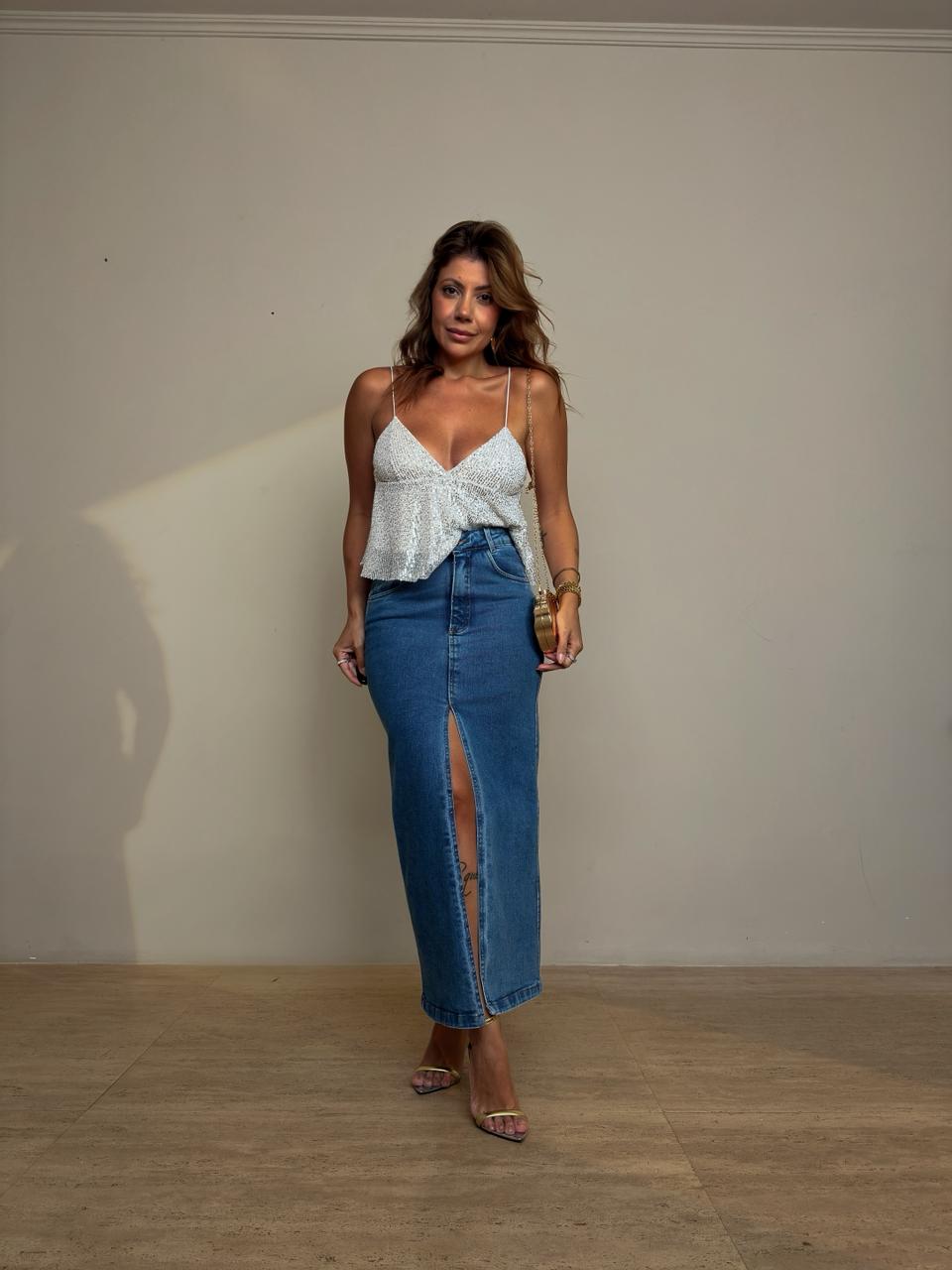 Saia jeans de lavagem escuro, com design moderno e feminino. Possui cintura alta que valoriza a silhueta e comprimento midi, trazendo equilíbrio entre estilo e conforto. O destaque fica por conta da fenda frontal, que garante mobilidade e um toque de sensualidade na medida certa. Confeccionada em jeans estruturado com elastano, é versátil e fácil de combinar. Tem bolsos frontais e traseiros.