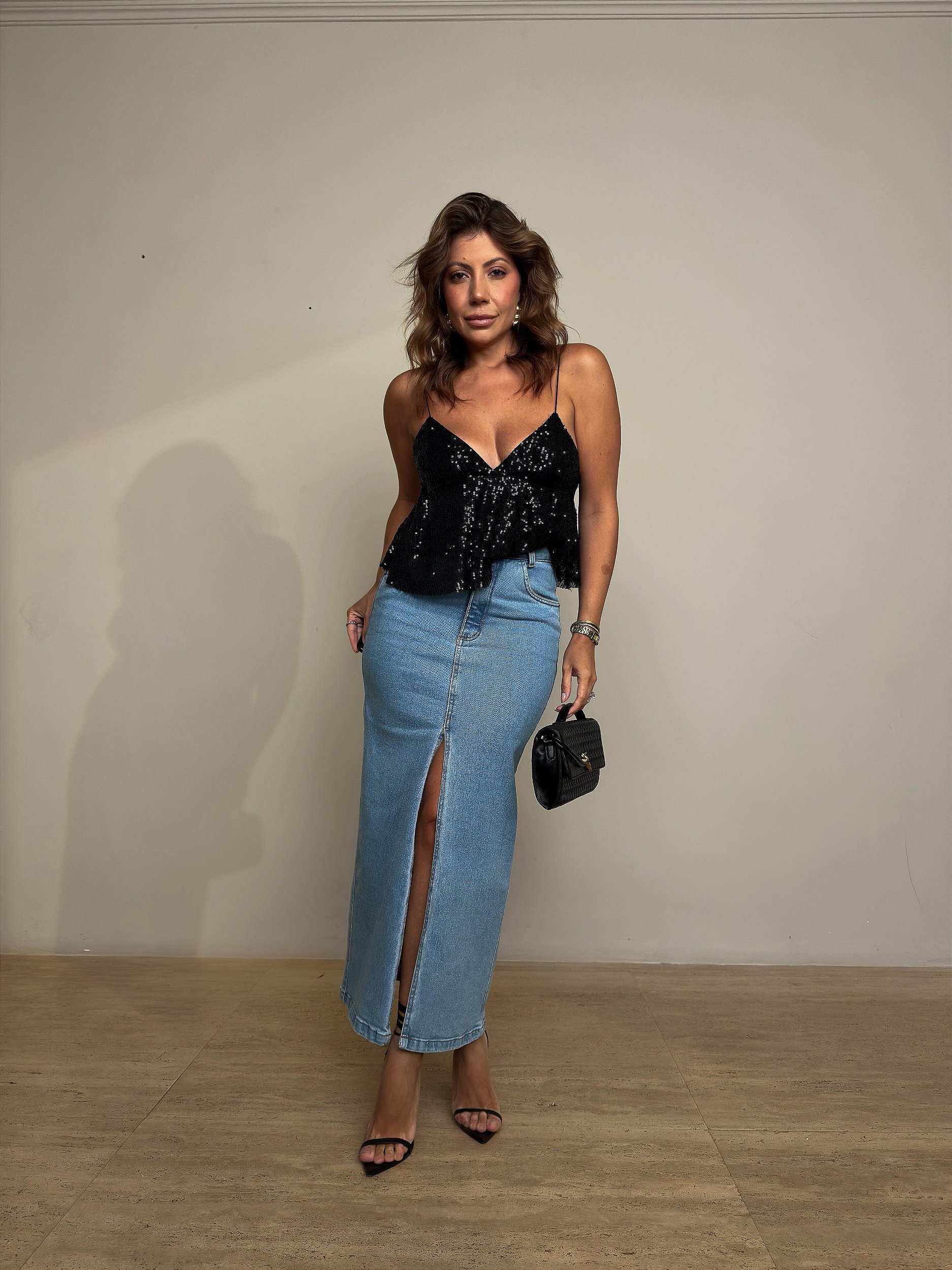 Saia jeans de lavagem clara, com design moderno e feminino. Possui cintura alta que valoriza a silhueta e comprimento midi, trazendo equilíbrio entre estilo e conforto. O destaque fica por conta da fenda frontal, que garante mobilidade e um toque de sensualidade na medida certa. Confeccionada em jeans estruturado com elastano, é versátil e fácil de combinar. Tem bolsos frontais e traseiros.