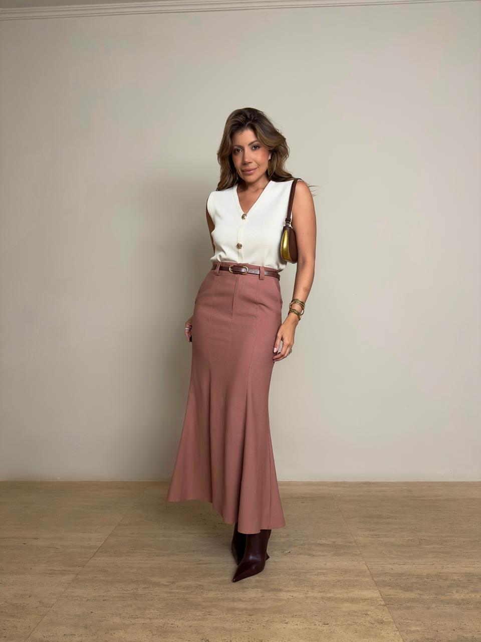 Saia midi capuccino elegante e versátil, é uma peça clássica que traz sofisticação para diferentes composições. Com modelagem fluida e caimento leve, valoriza a silhueta e garante movimento delicado ao caminhar. Tem fechamento frontal por botão e zíper, possui bolsos faca.