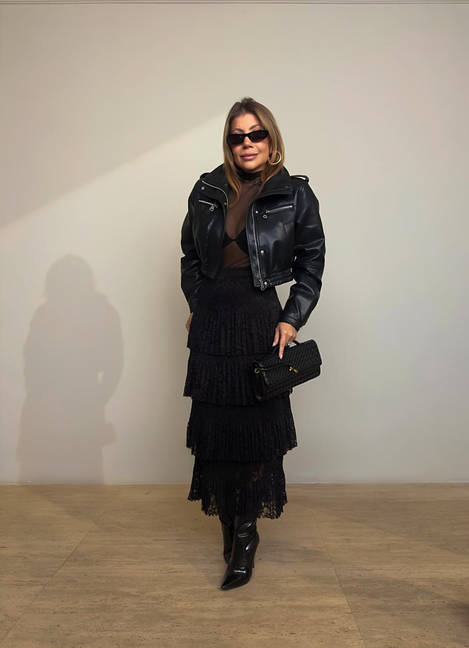 Saia preta de renda midi sofisticada, perfeita para composições elegantes e cheias de personalidade. Com design em camadas e textura rica, ela traz movimento e um visual marcante, valorizando o look com um toque romântico e moderno ao mesmo tempo. Seu caimento fluido proporciona leveza, enquanto o acabamento em renda trabalhada adiciona delicadeza e charme à peça. Possui cós de elástico.