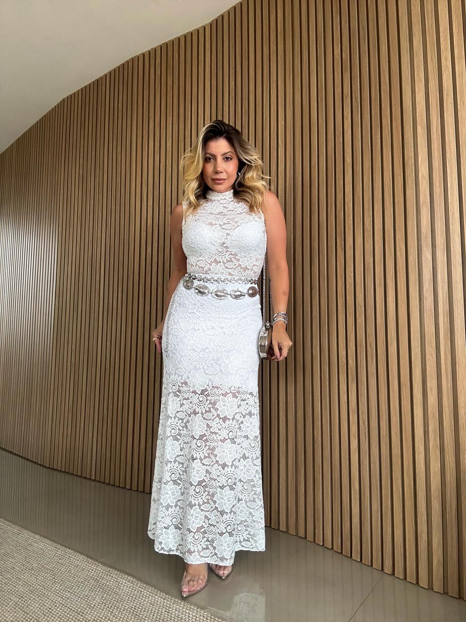 Saia midi em renda branca de modelagem reta levemente evasê, que valoriza a silhueta com elegância. O desenho delicado da renda cria um visual sofisticado e feminino, enquanto o forro curto destaca sutilmente a transparência do trabalho rendado. Possui elástico na cintura.