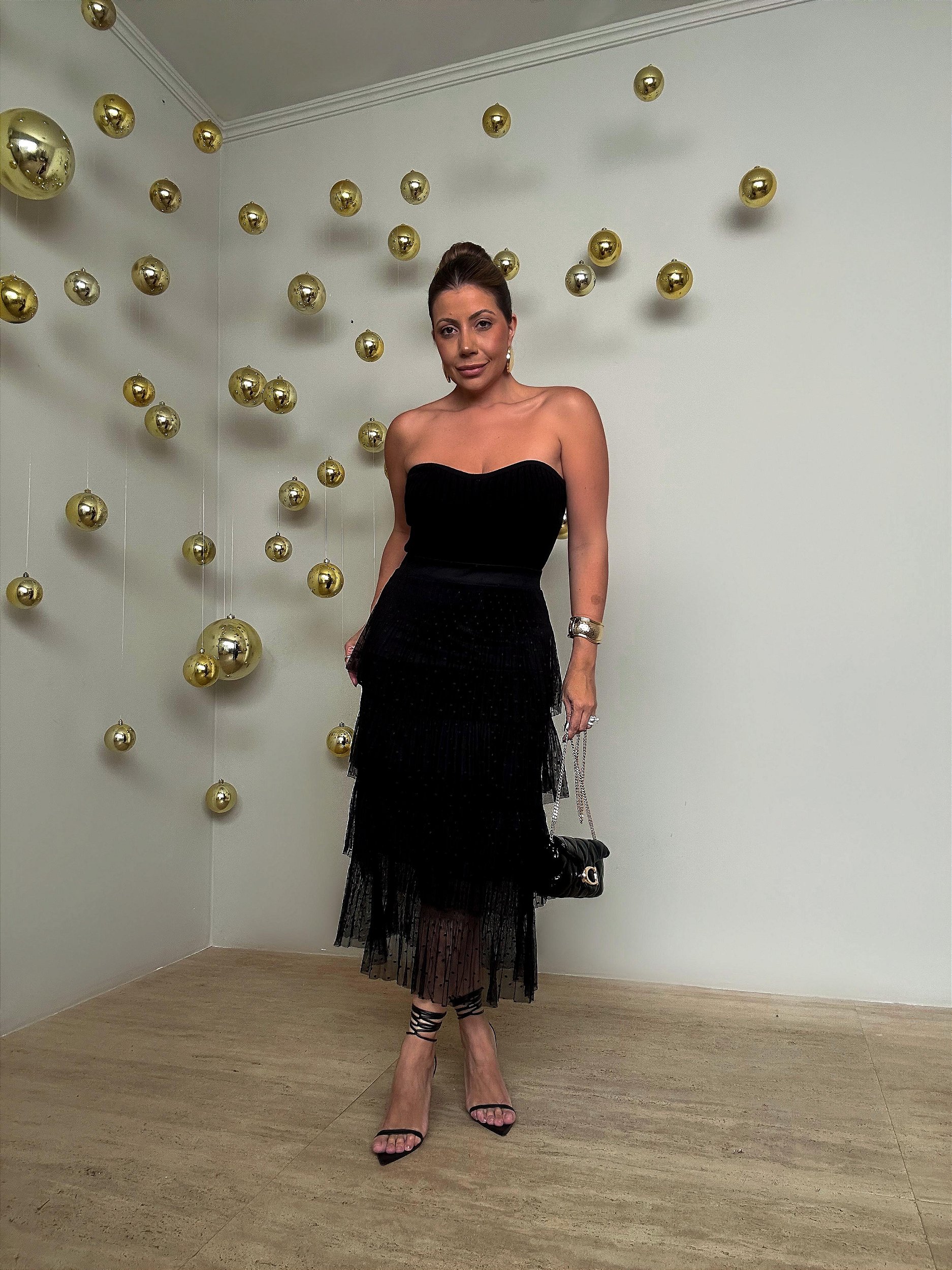 Saia midi preta confeccionada em tule leve com delicadas bolinhas em relevo, que trazem textura e um toque romântico à peça. Possui transparência sutil na barra, criando movimento e elegância. Possui elástico no cós.