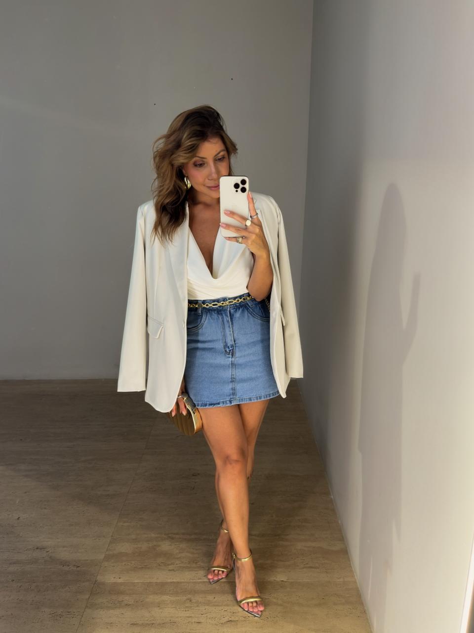 Saia Short Jeans Curto Claro, possui bolsos frontais e traseiros, fechamento por zípper e botão, e forro interno de shortinho. Uma peça versátil e moderna.
